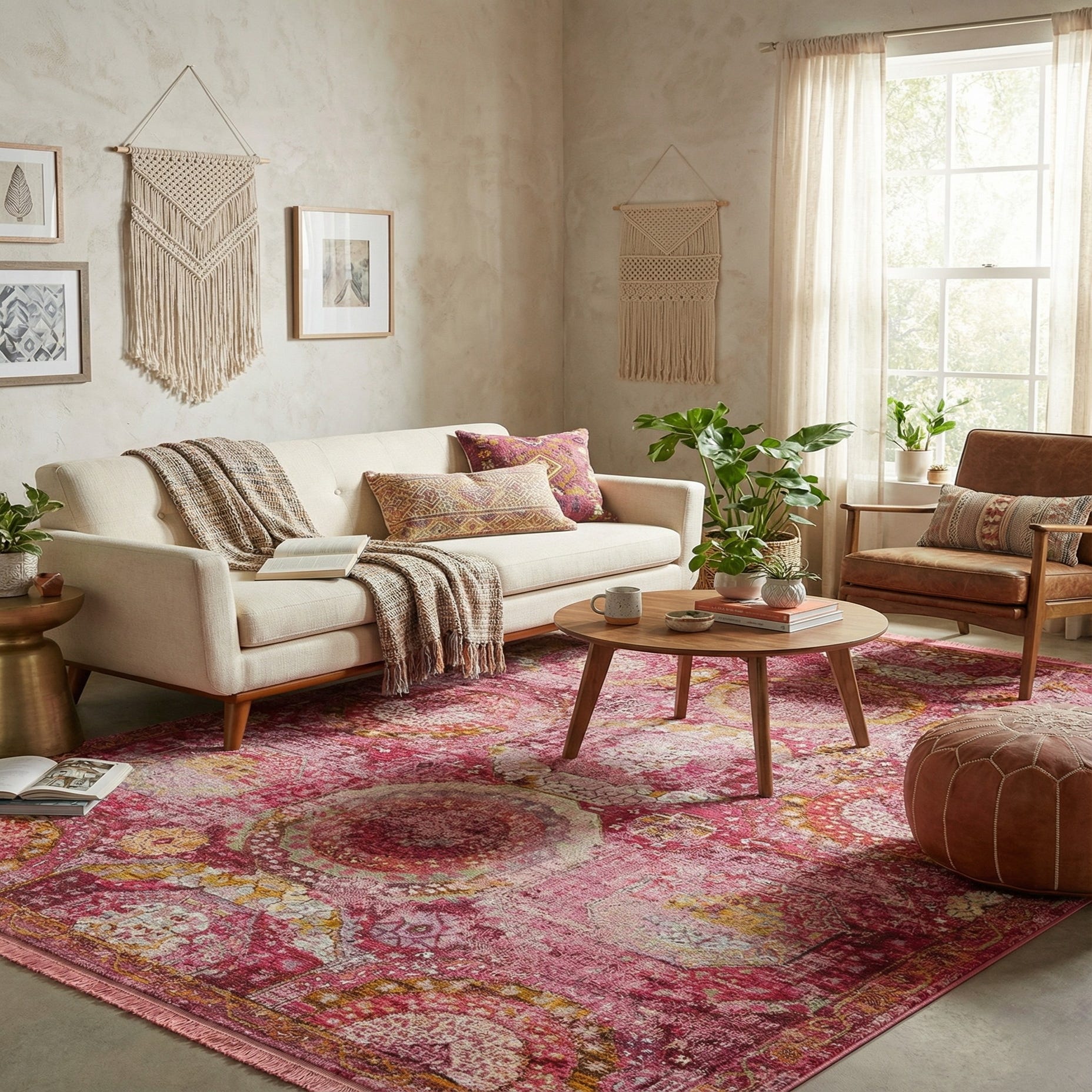 The bold color palette makes this rug an ideal choice for spaces in need of a strong visual anchor or an infusion of energy and warmth. It complements eclectic interiors, harmonizes with bohemian elements, or provides a pop of color in a more subdued contemporary or transitional room. Its stain-resistant qualities and lack of shedding make it a practical choice for high-traffic areas such as living rooms, dining areas, or creative studio spaces.