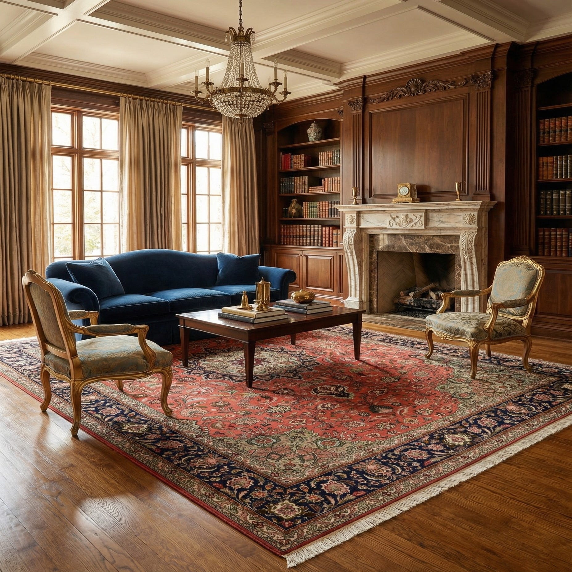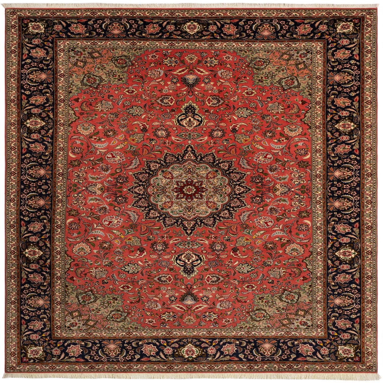 A 7x10 rectangular Persian Tabriz rug with a detailed floral medallion on a pink field, bordered by dark blue.