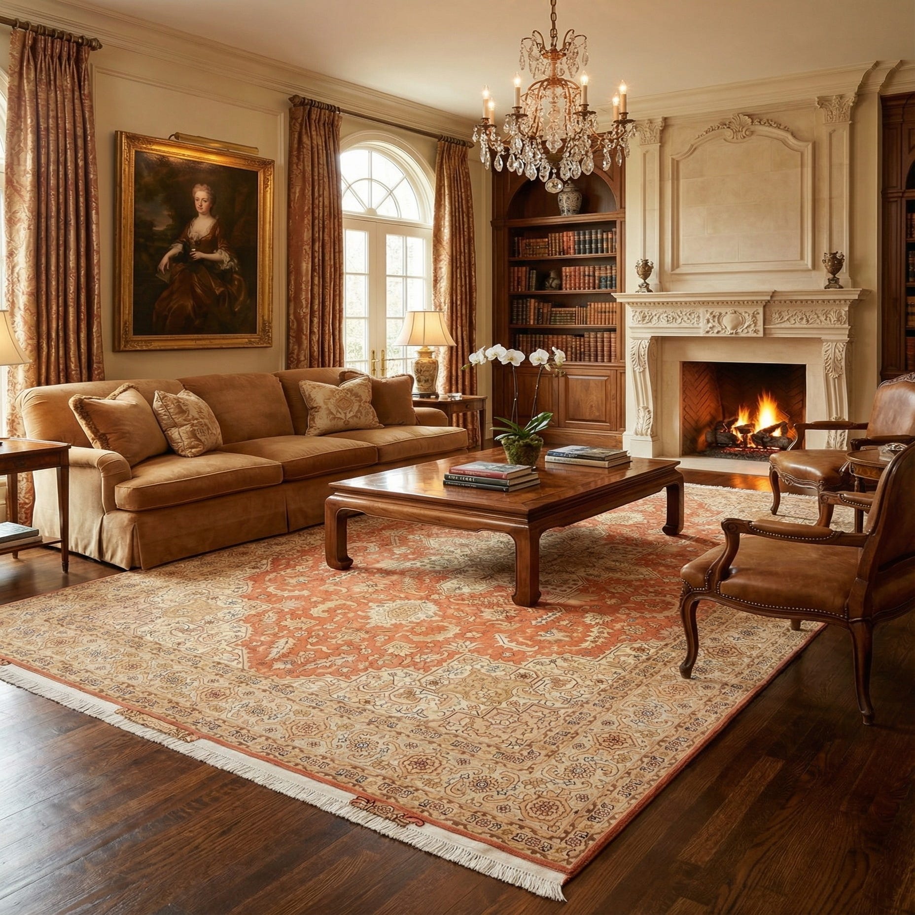 A 7x10 rectangular Tabriz Persian rug in shades of pink and cream, featuring an intricate floral medallion pattern.