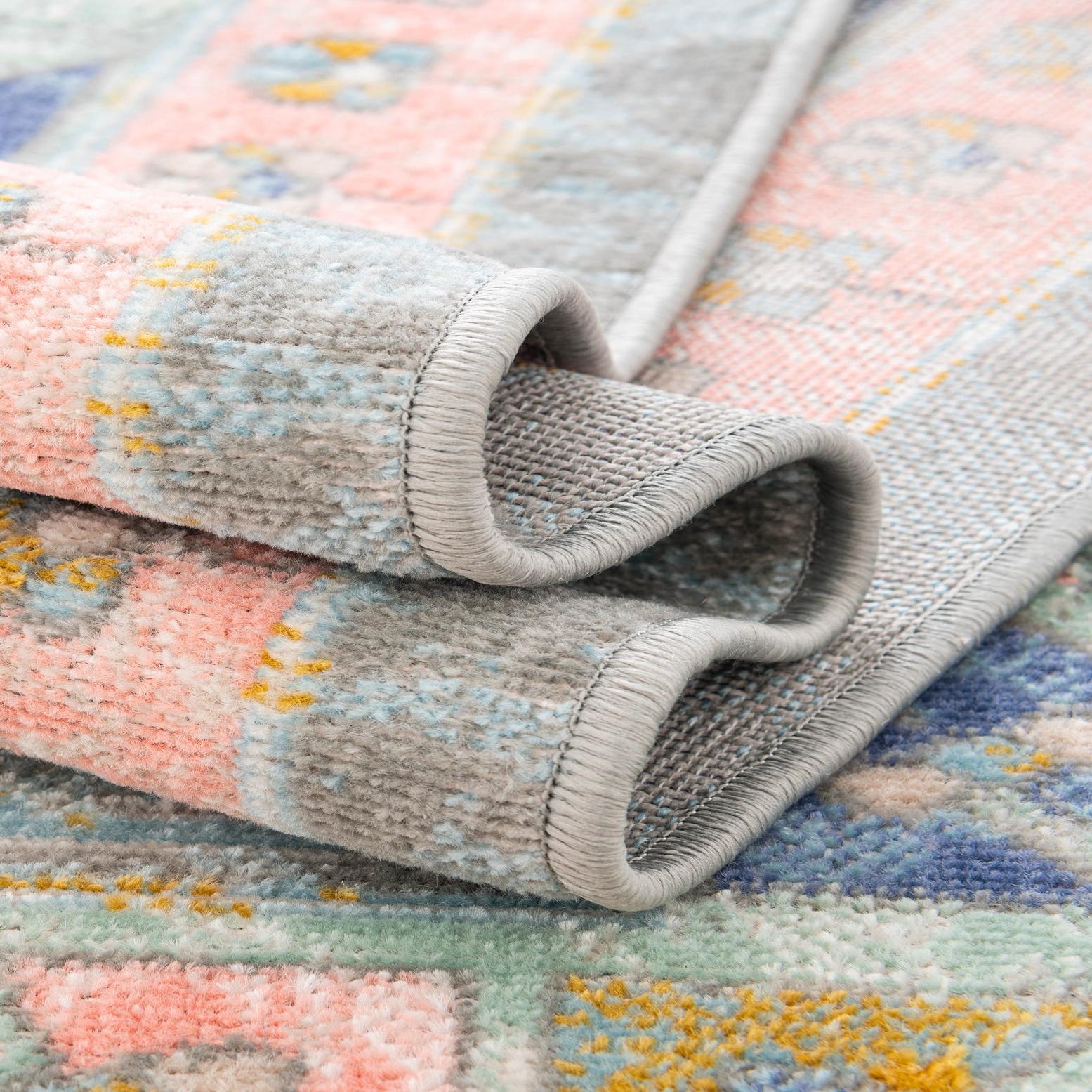 Primary color is Pink. Colors in this rug include: Pink, Blue, Gold, Gray, Light Blue, Light Green.