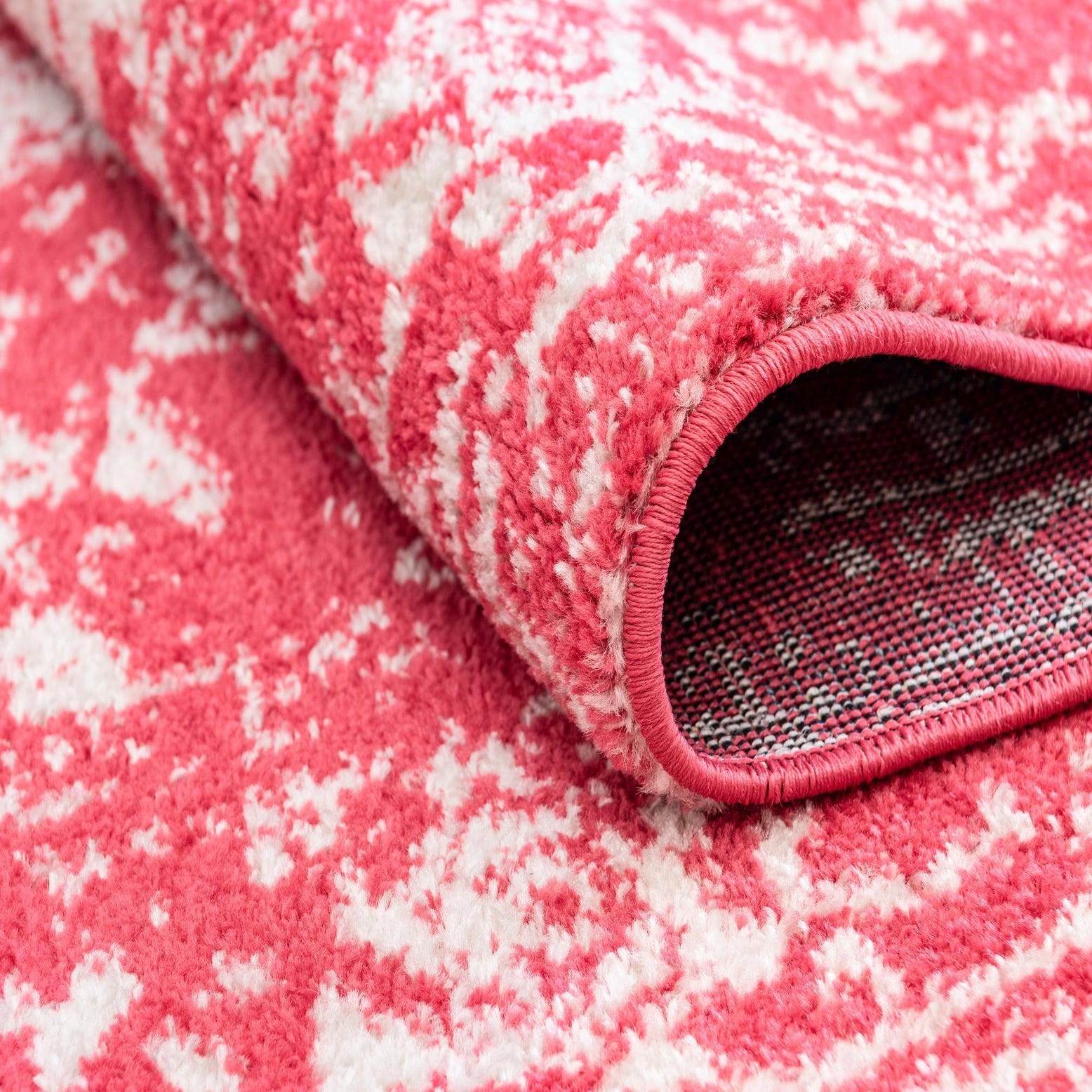 A vintage-inspired medallion pattern rests on a warm pink ground, with ivory motifs and distressed accents that give the design an aged, relaxed character. The ornate center medallion and scrolling border draw on traditional Persian ornamentation while the faded ivory highlights soften the overall look. Machine Made of 100% Polypropylene, the rug has a low, dense pile with a smooth, slightly lustrous hand that feels comfortable underfoot.