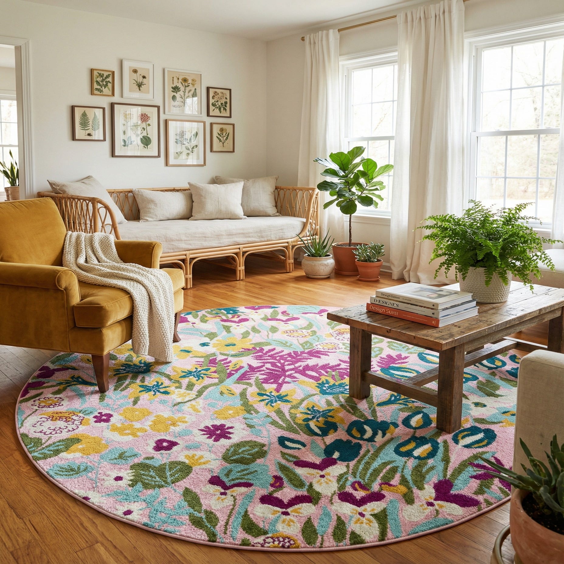 A lively botanical pattern spills across a pink background, with layered florals and foliage that feel hand-drawn yet crisp. Ivory blossoms, light blue and teal accents, yellow blooms, green leaves and pops of purple combine to create a garden-like composition that fills the round silhouette. Machine-made from 100% polypropylene, the rug has a low-to-medium, densely tufted pile that feels soft underfoot and shows the color contrasts with clear definition and a subtle, satiny finish.