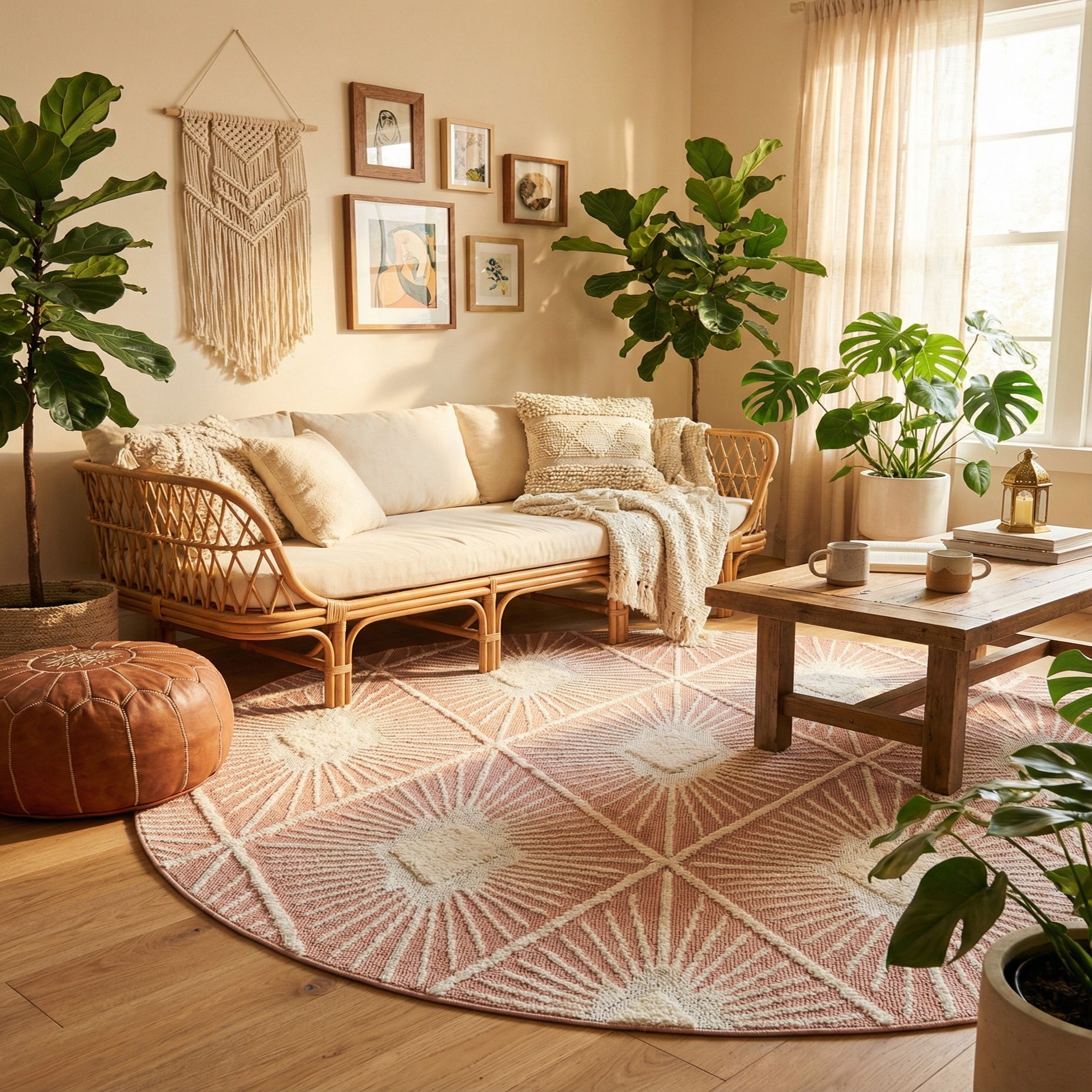 This Boho Collection 8 Ft Round rug showcases a harmonious blend of pink and ivory tones, creating a soothing yet vibrant atmosphere. The pattern features a series of geometric motifs that radiate from the center, producing a dynamic and modern aesthetic. The juxtaposition of the soft ivory against the warm pink background gives this rug visual depth and interest. Machine-woven of 100% polyester, the rug offers a balance of durability and soft texture, embracing both function and comfort.