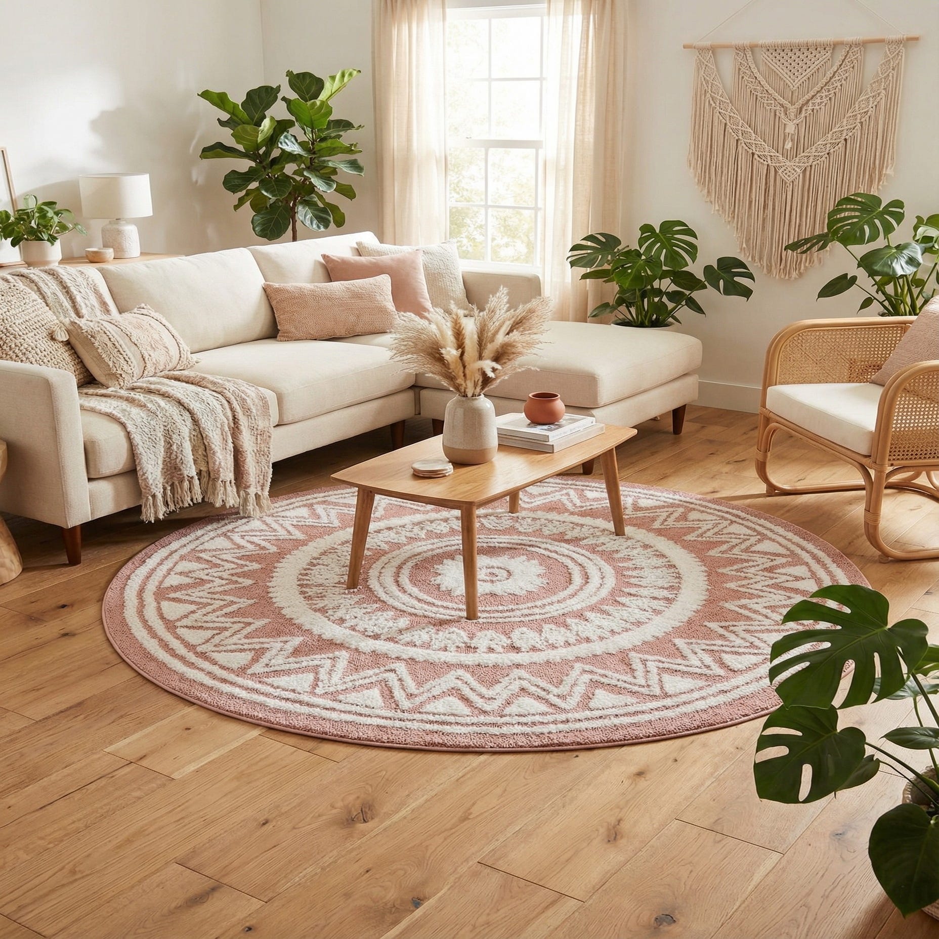 A round pink and white rug featuring a Southwestern-inspired medallion pattern with tribal zigzags and a central floral motif.