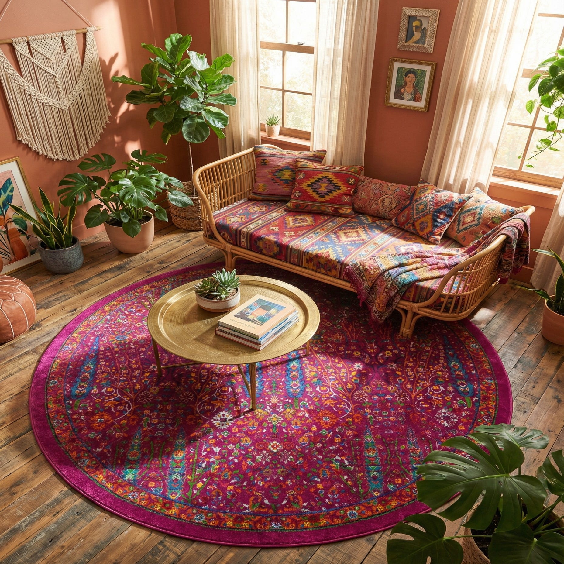 Machine-made from 100% polypropylene, the rug has a low, dense pile with a soft hand and a slight sheen that sits flat underfoot. The construction keeps the colors saturated and the intricate motifs clear. Use it to anchor a lively living room or an eclectic bedroom, place it beneath a round dining table to echo the shape, or layer it in a bohemian setting for added color and pattern. It pairs especially well with neutral upholstery to let the rug be a focal point or with mid-century wood pieces for a playful, modern mix.