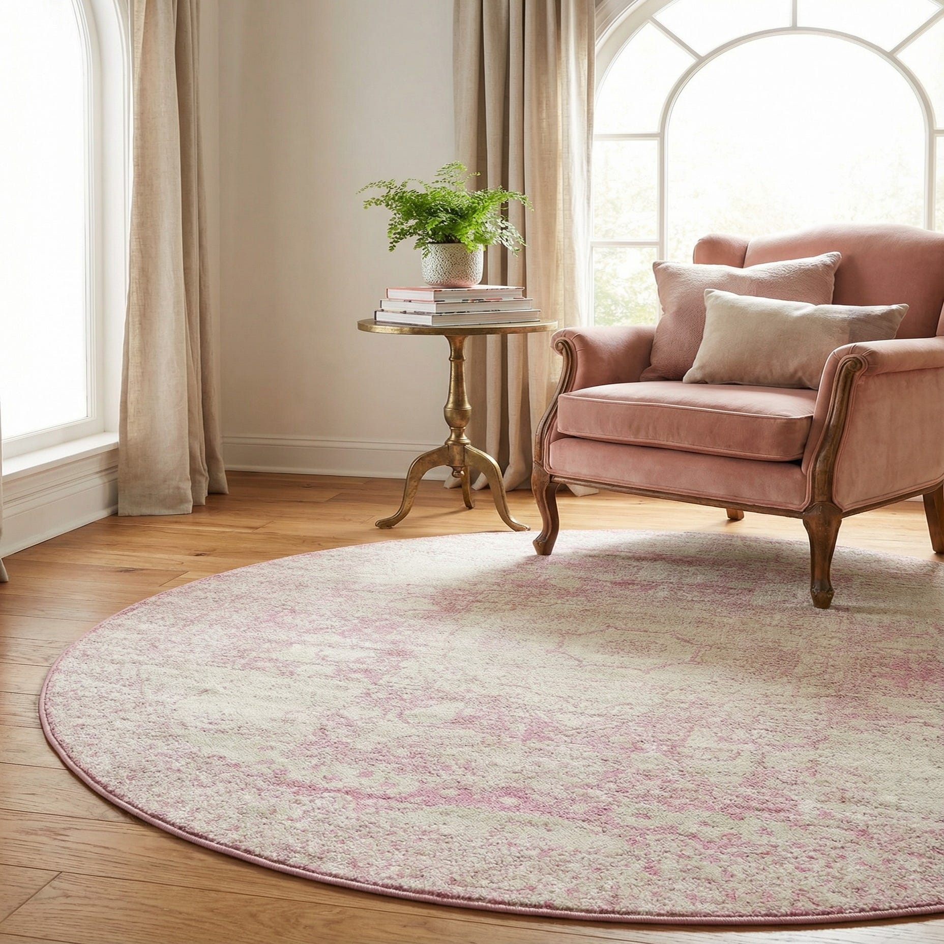 A soft, vintage-inspired medallion pattern emerges from a low-contrast wash of pink and ivory, giving the rug a gently aged, lived-in look. The pink background provides a warm foundation while ivory motifs and subtle distressed detailing create visual depth without heavy contrast. The round shape highlights the central medallion and lends a calm, balanced presence to the room.