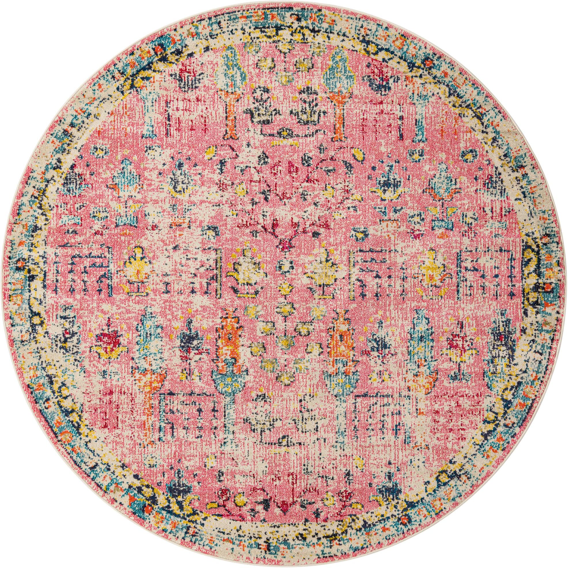 Primary color is Pink. Colors in this rug include: Pink, Blue, Gold, Navy Blue, Olive, Orange, Red, Purple.