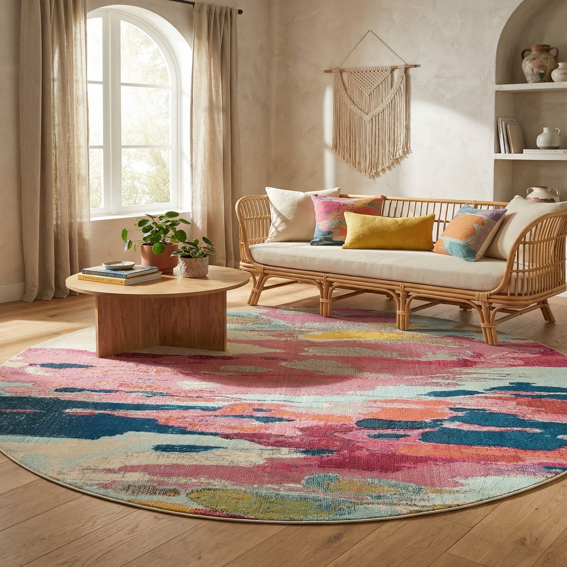 This round piece anchors seating or dining areas and pairs well with mid-century modern furnishings, warm wood tones, or a neutral sectional to let the colors pop. It also livens a child's room, home office, or an eclectic living space when combined with textured throws and simple accent pillows. Use it to introduce color without overwhelming the room, or layer with natural fibers and crisp white trim for a contemporary, collected look.