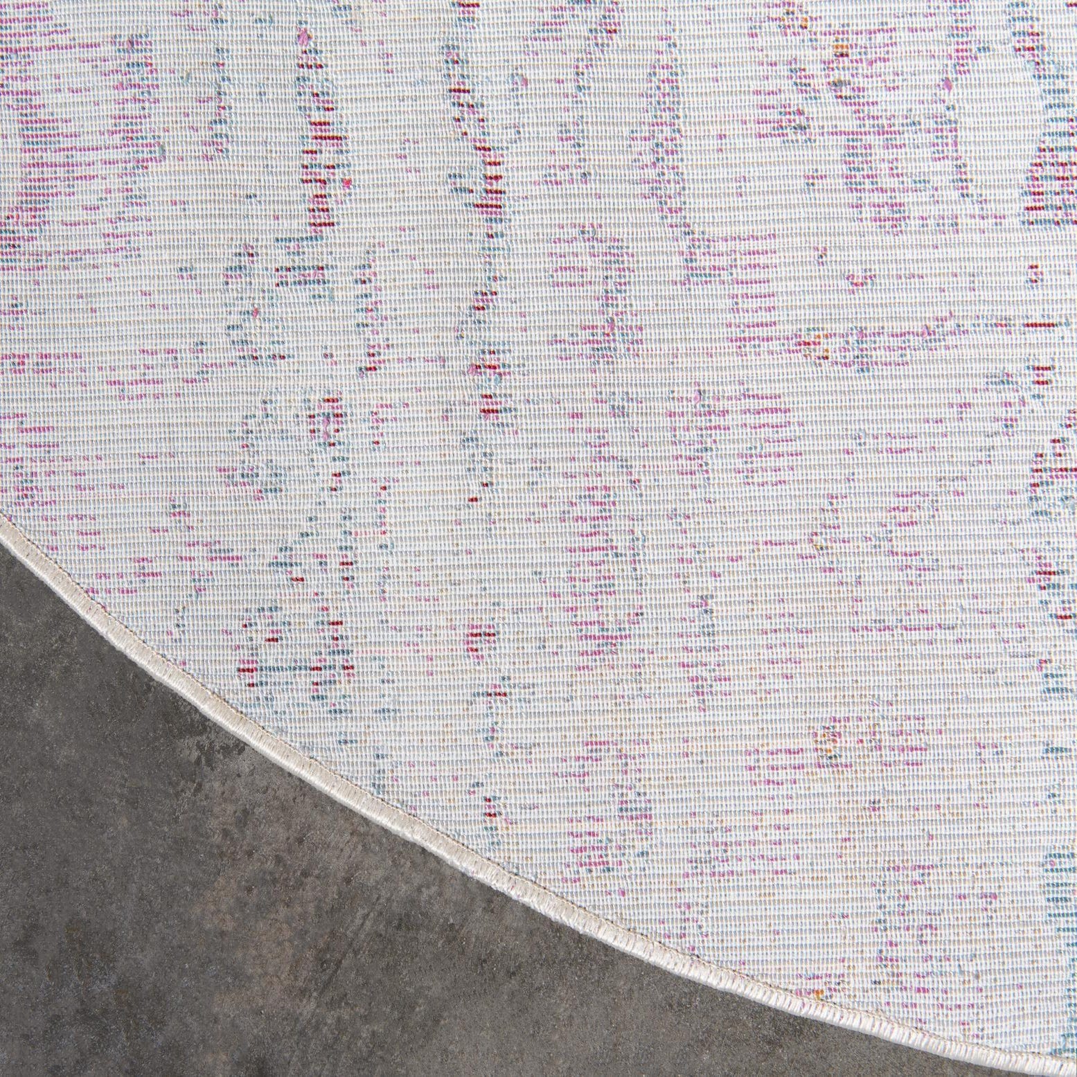 The Santiago Collection offers a machine-woven 8-foot round rug crafted from 100% polypropylene, ensuring durability and a shed-free experience. This particular design features a vibrant pink background, imbued with an amalgamation of colors such as blue, ivory, red, yellow, and turquoise. The enchanting pattern presents an intricate medley of motifs that draw from traditional influences, creating a dynamic visual texture that acts as an accent piece in a variety of interior settings.