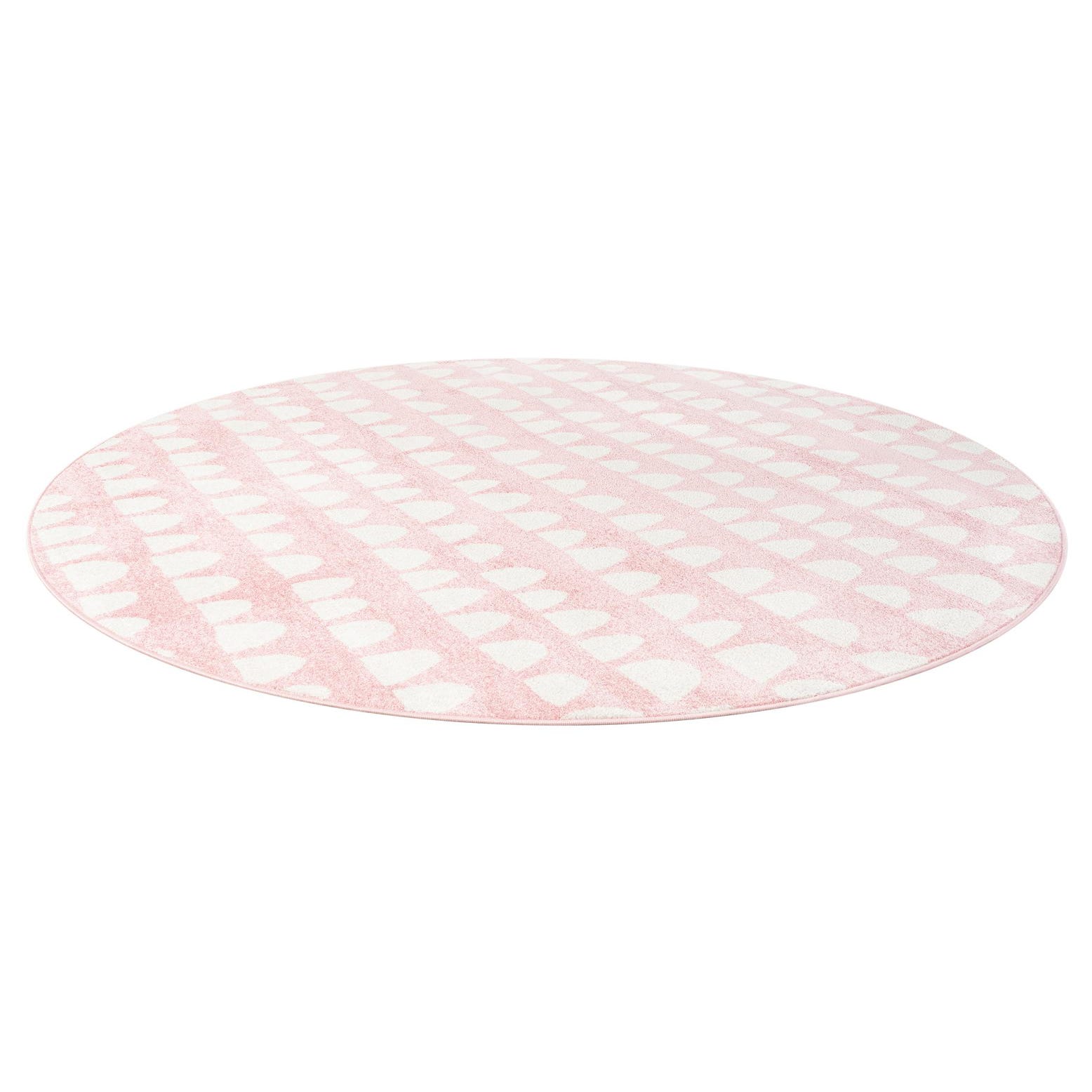 A 7' 10 x 7' 10 round pink rug with a modern abstract pattern of white, half-moon shapes.
