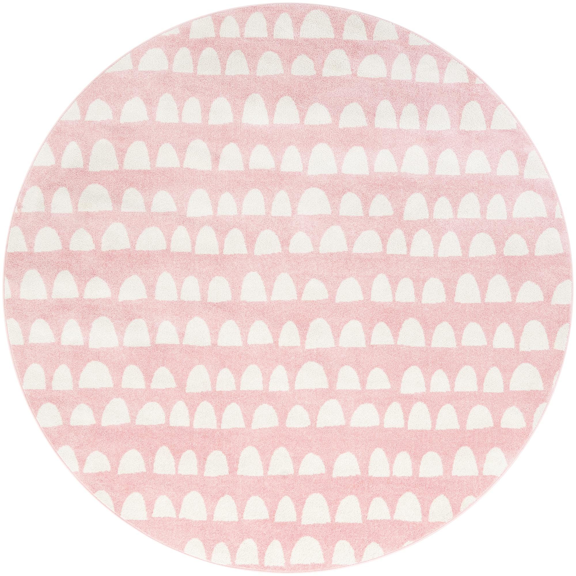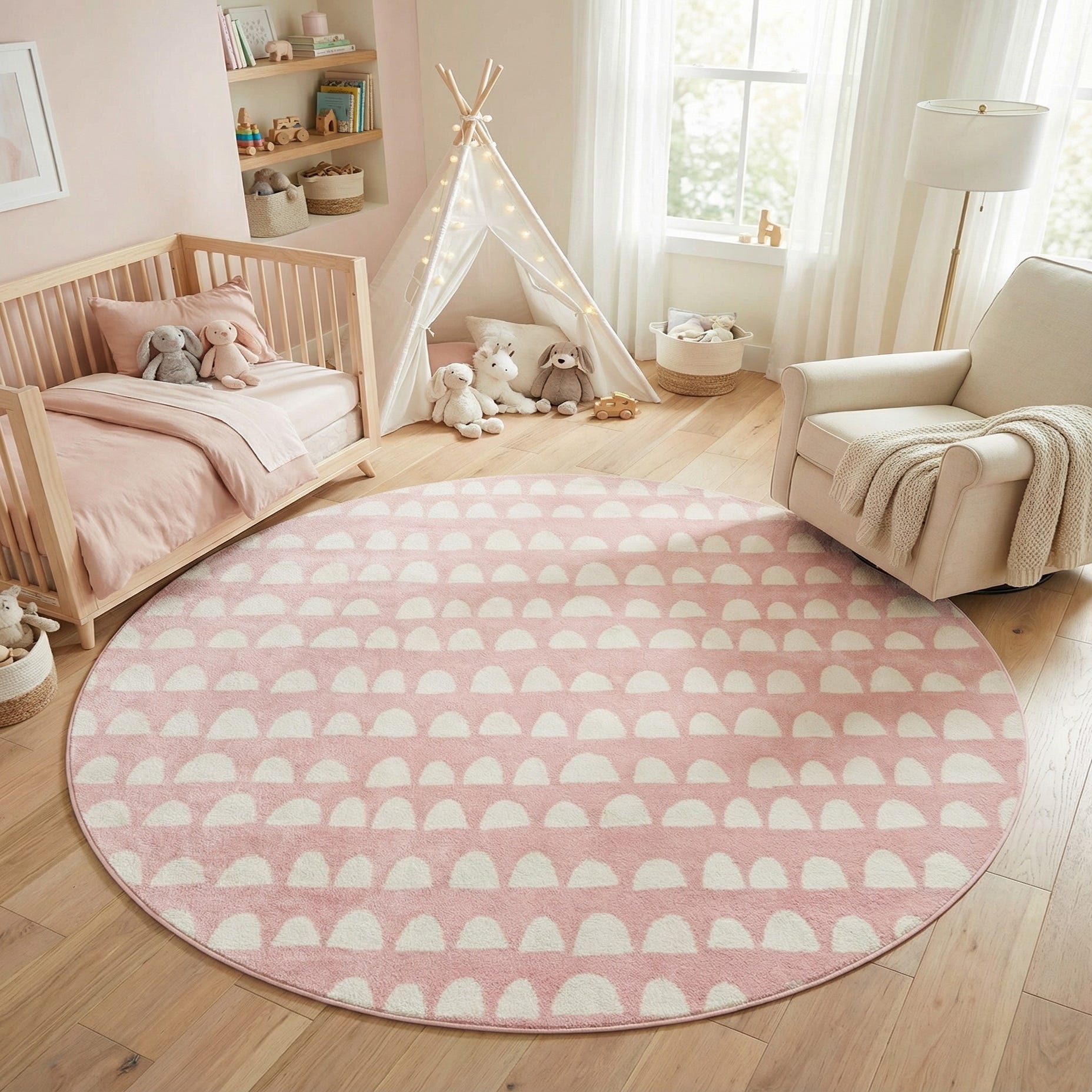 A 7' 10 x 7' 10 round pink rug with a modern abstract pattern of white, half-moon shapes.