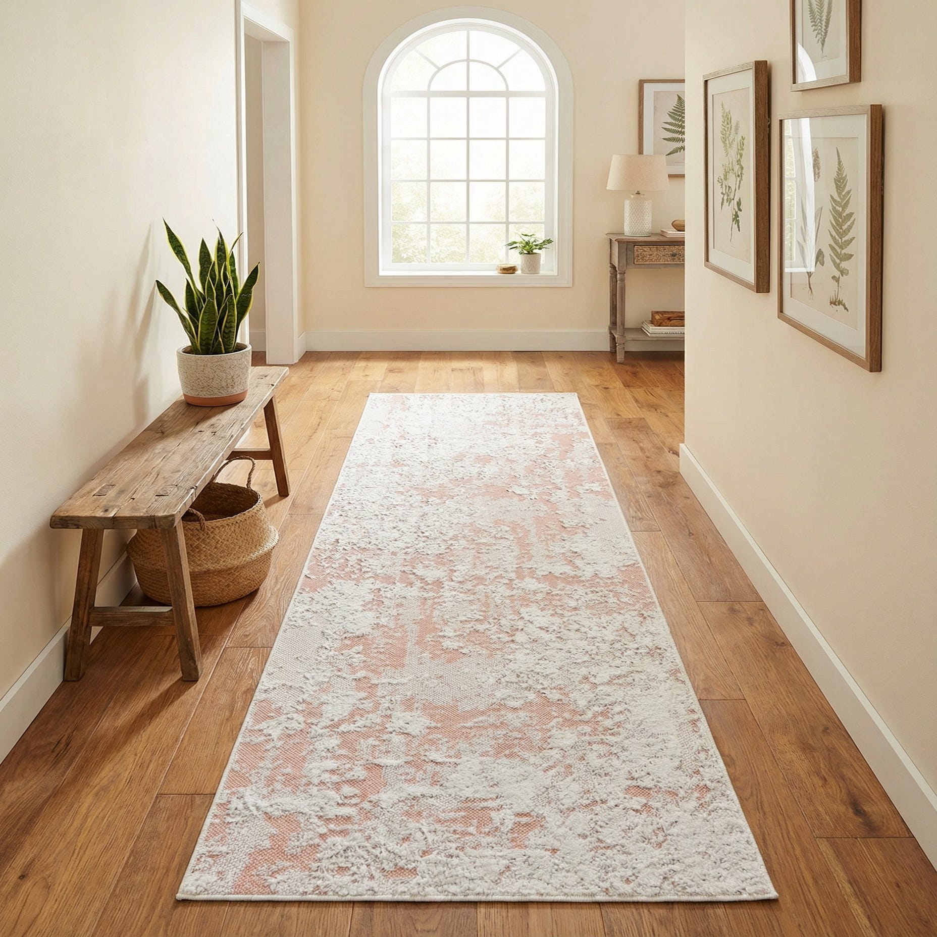 A pink and white 8 ft runner rug with an abstract, textured pattern, ideal for a hallway or kitchen.