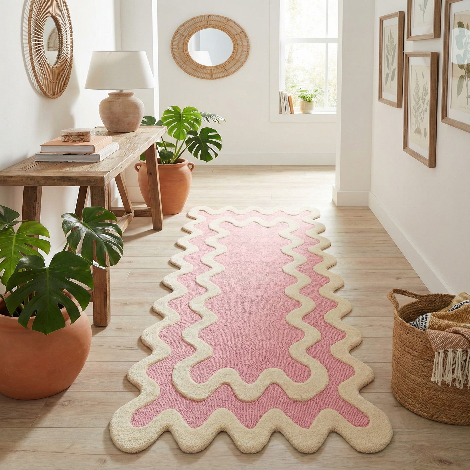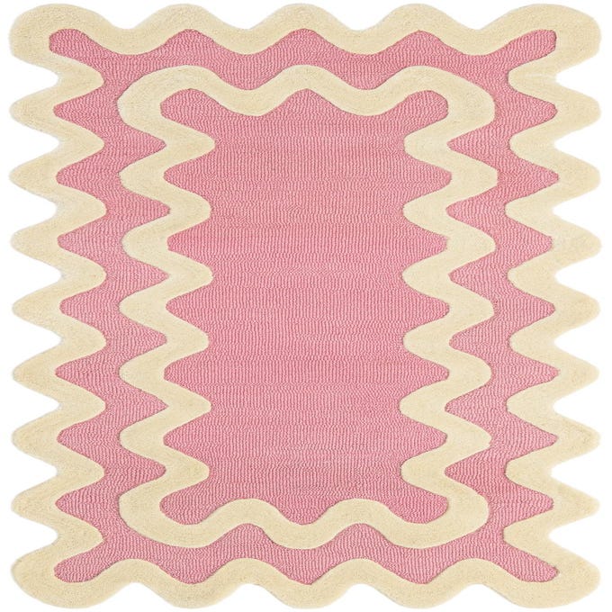 A pink 8 ft runner rug with a wavy, cream-colored border, featuring a high, textured wool pile.