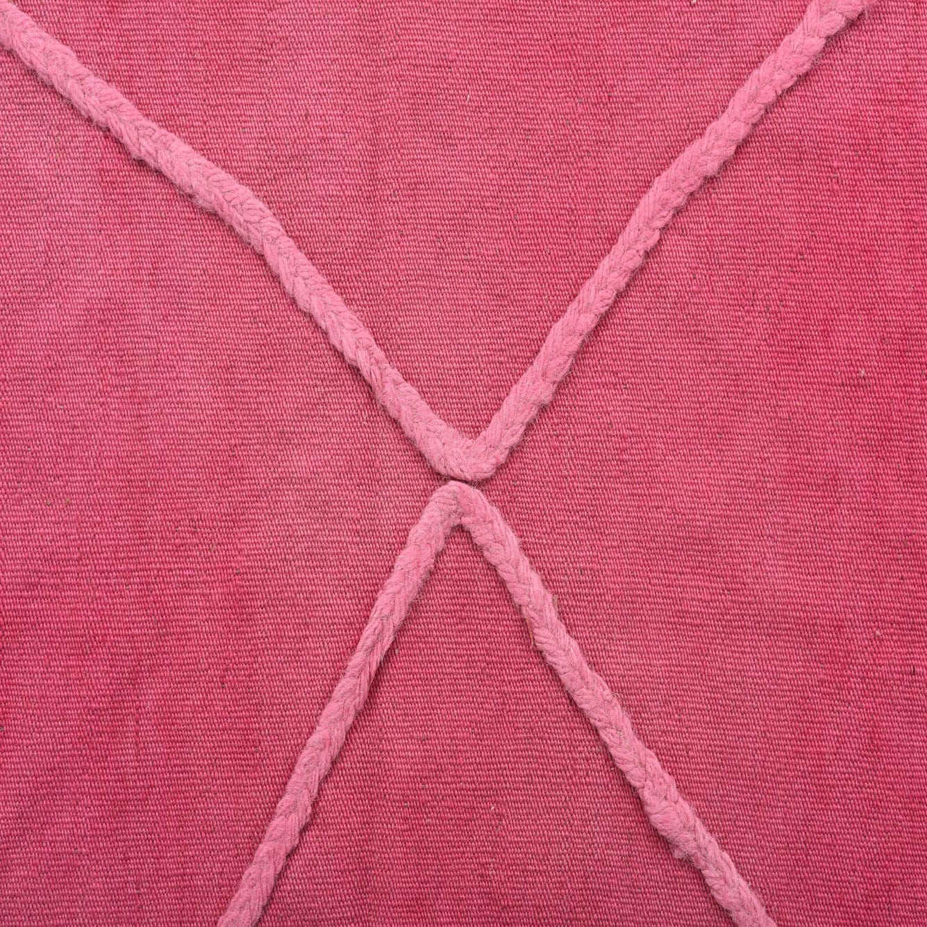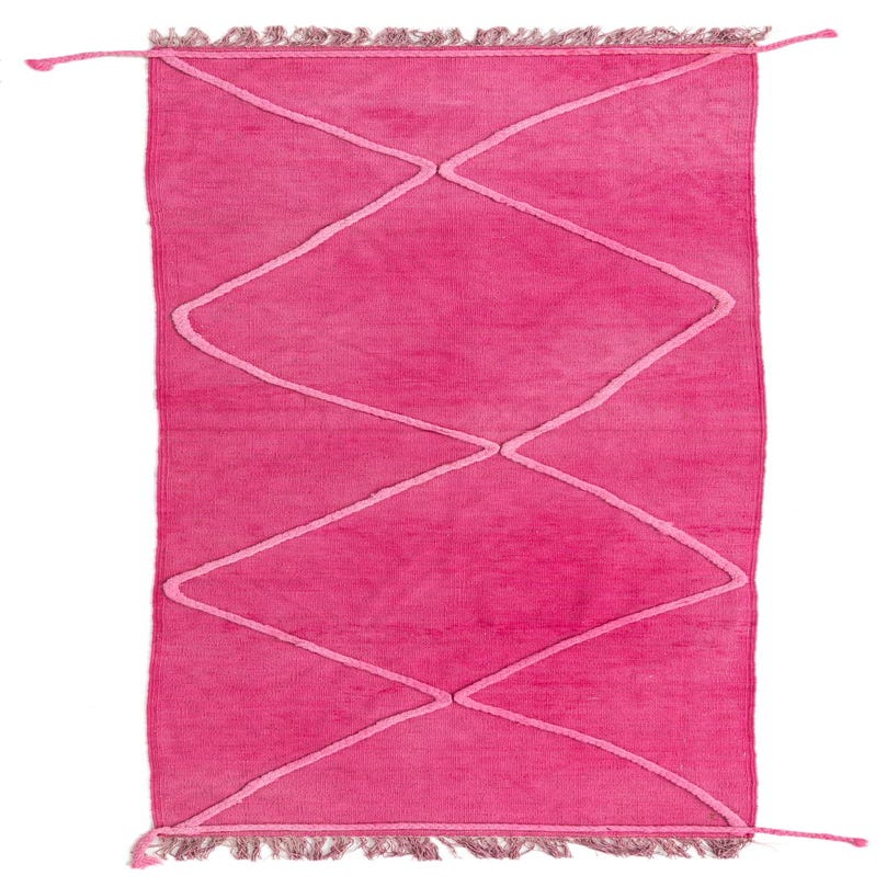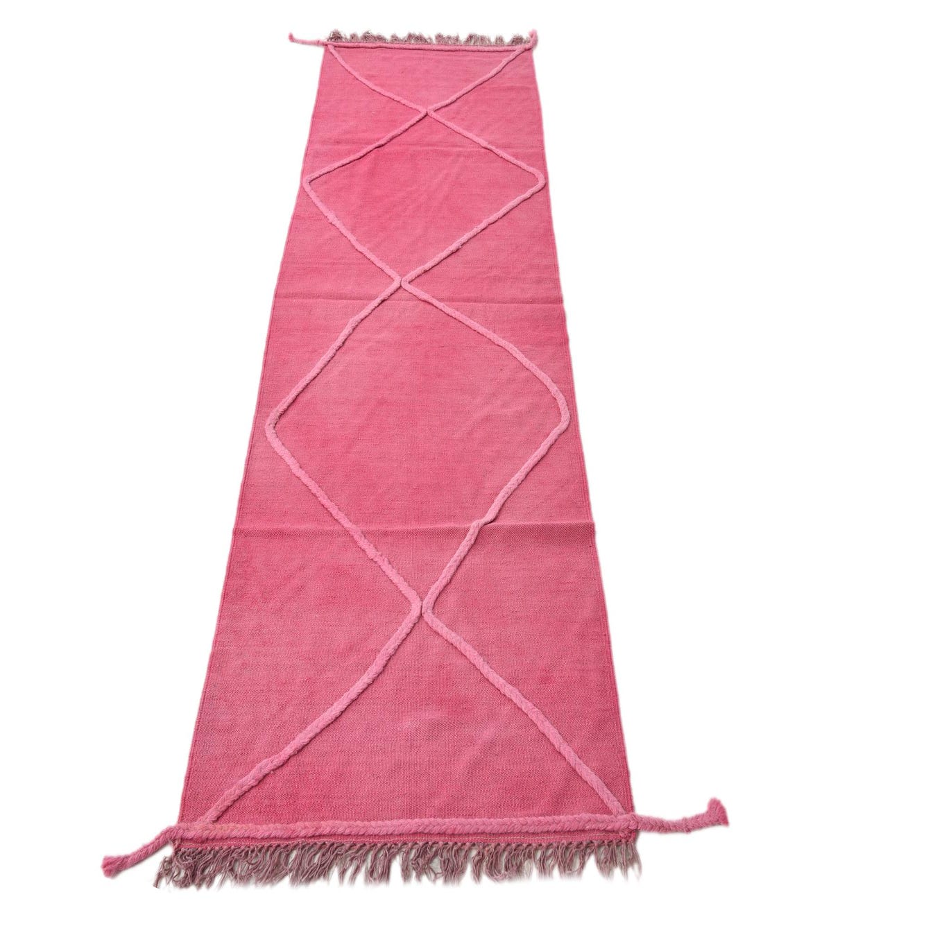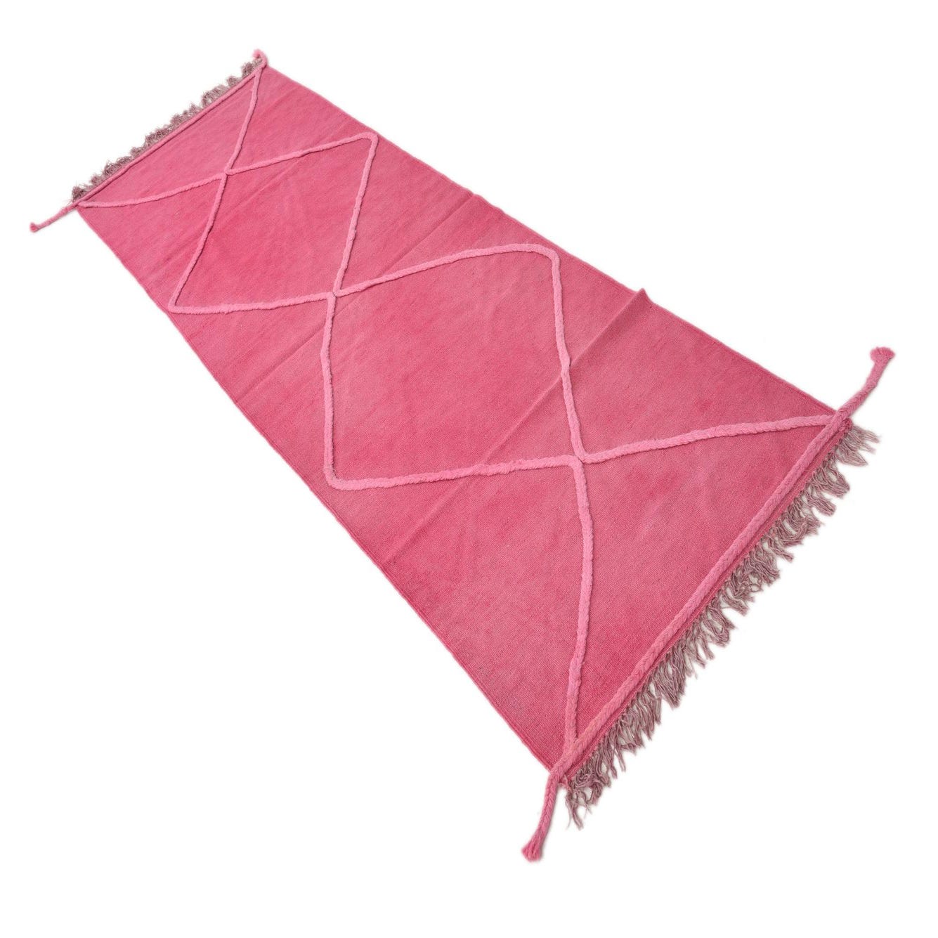 A vibrant pink 8 ft runner rug with a light pink diamond tribal pattern and fringed ends, perfect for a hallway.