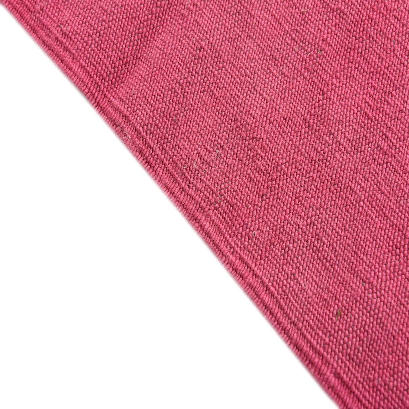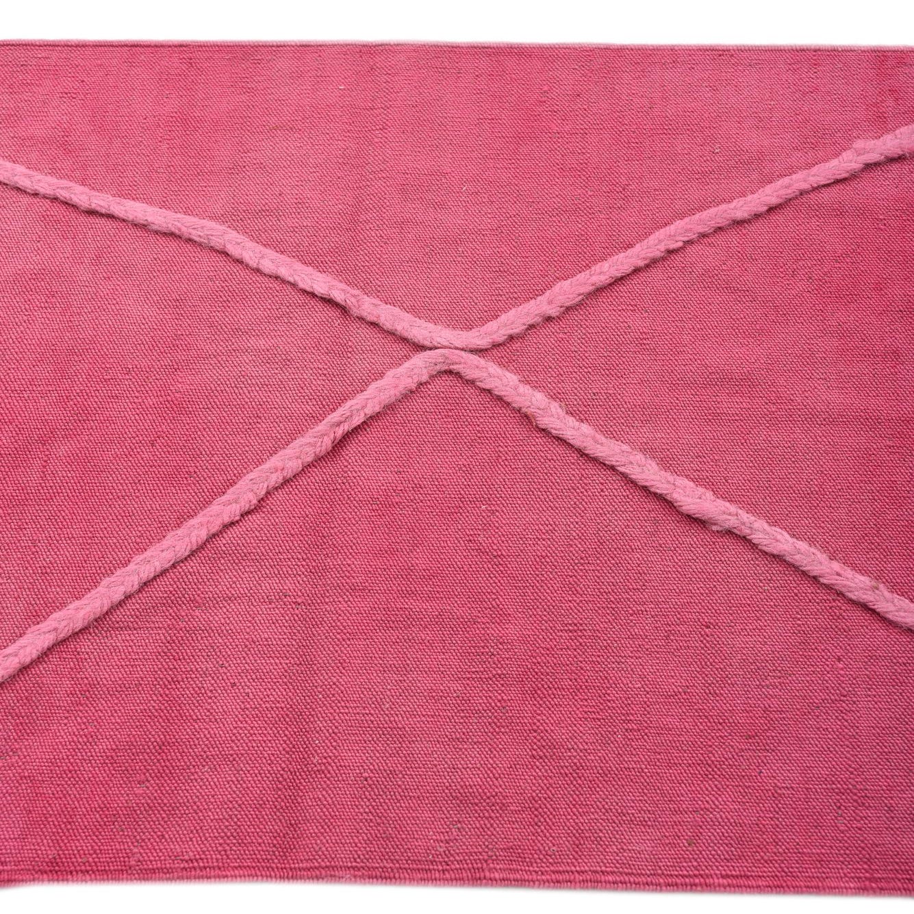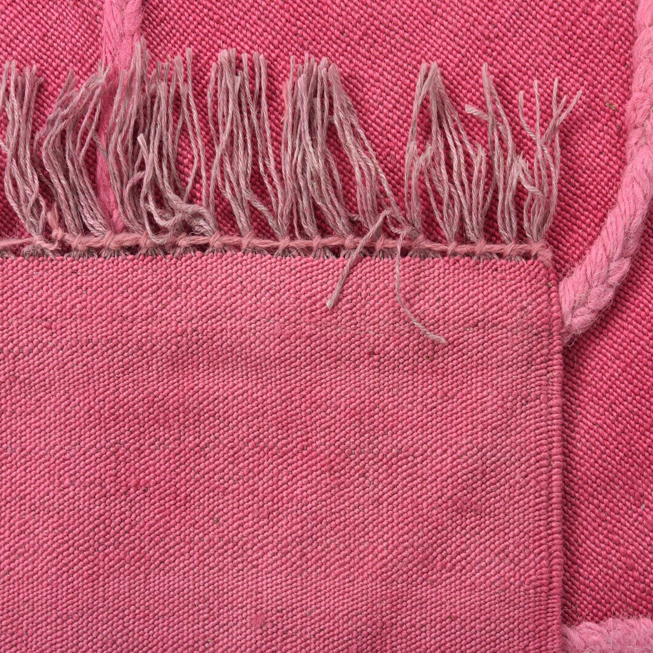 A vibrant pink 8 ft runner rug with a light pink diamond tribal pattern and fringed ends, perfect for a hallway.