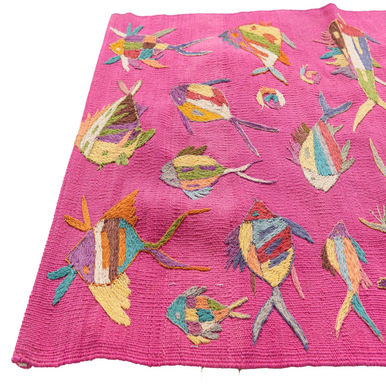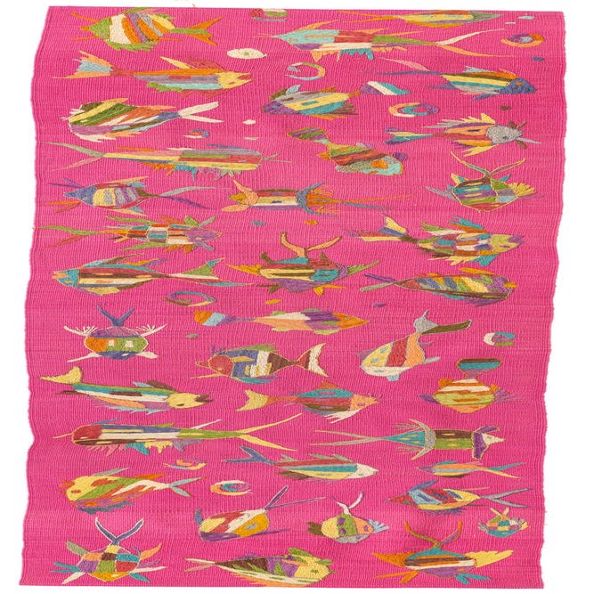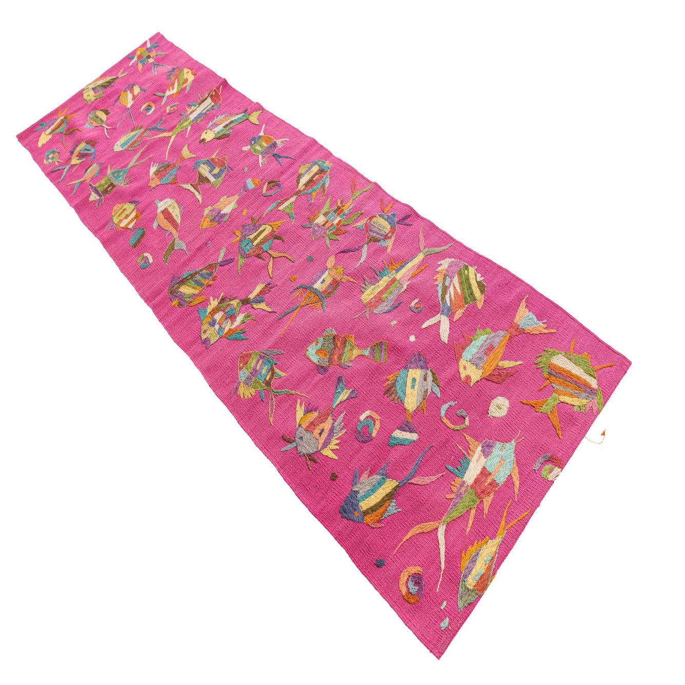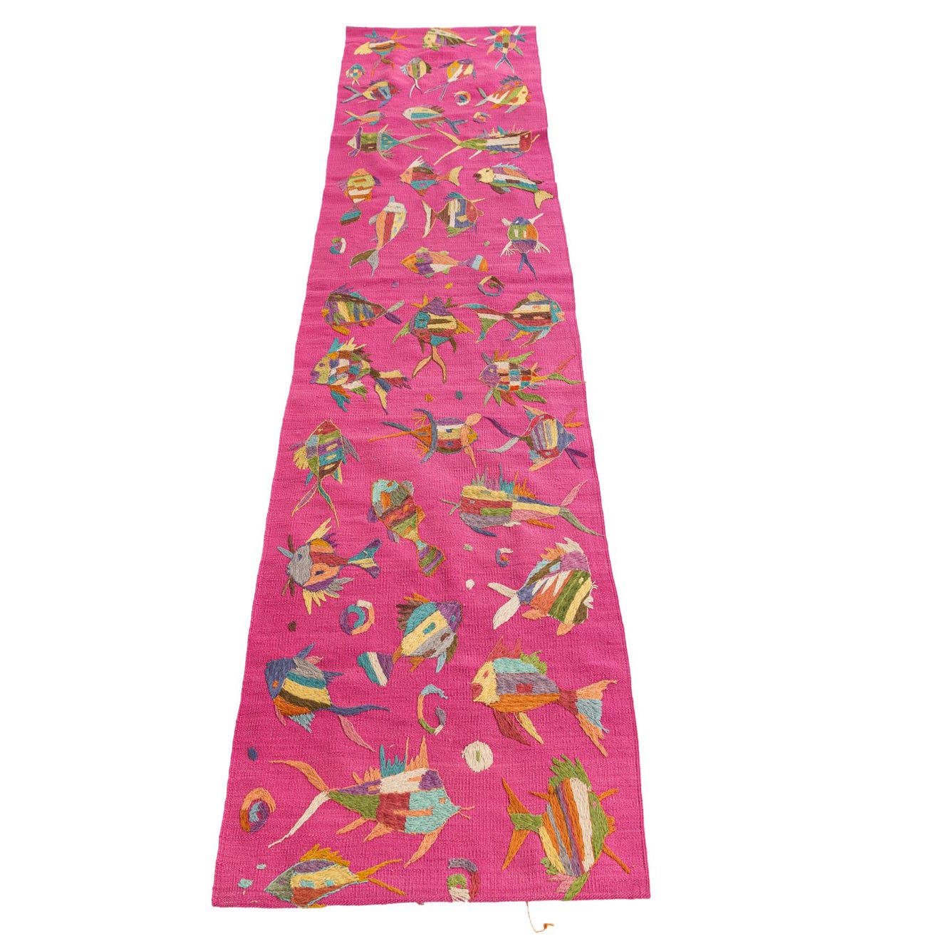 This Kilim Suzani hand-woven rug boasts a vibrant and playful pattern featuring a collection of colorful fish amidst a lively pink background. The fish designs incorporate a range of hues including beige, blue, brown, gold, green, ivory, olive, red, violet, and yellow, resulting in a piece that captures both whimsy and artisanal charm. Crafted with 100% wool, this 8 Ft runner possesses a flat weave structure, offering a smooth, durable surface that can sustain high traffic areas.