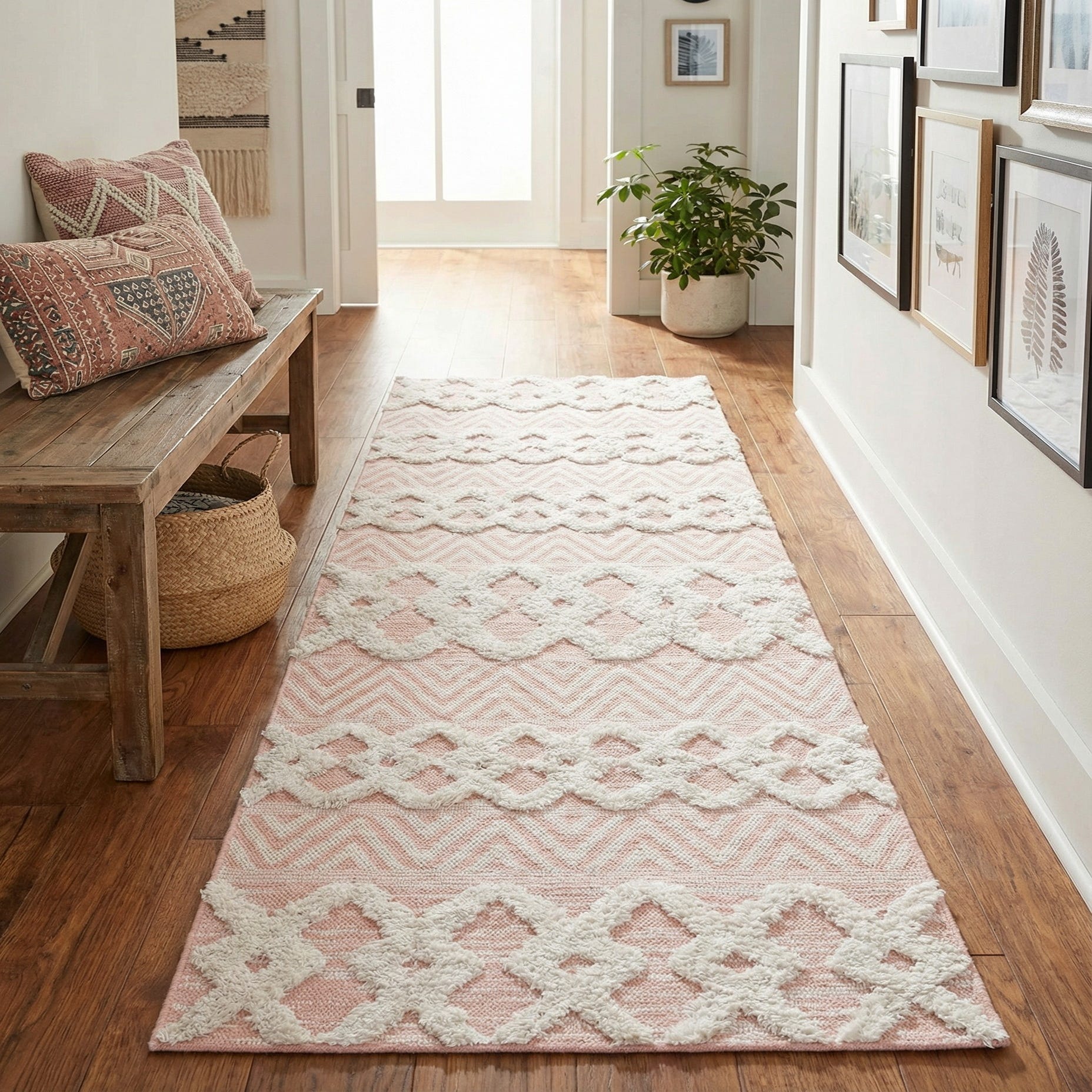This runner is well-suited for hallways, entryways, or alongside a bed where a soft, feminine palette is desired. It pairs nicely with light wood tones, white or ivory furnishings, and brass or matte black accents for a fresh, balanced look. It also complements nursery, cottage, Scandinavian, or relaxed modern interiors where soft color and textured pattern add warmth without overwhelming other elements.