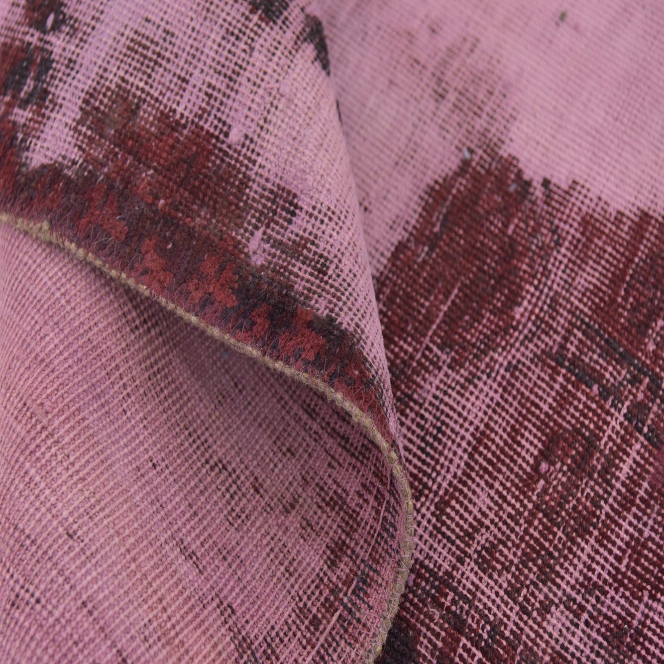 A handmade 8 ft runner rug featuring an abstract, distressed Persian pattern in shades of pink and maroon, ideal for a hallway or kitchen.