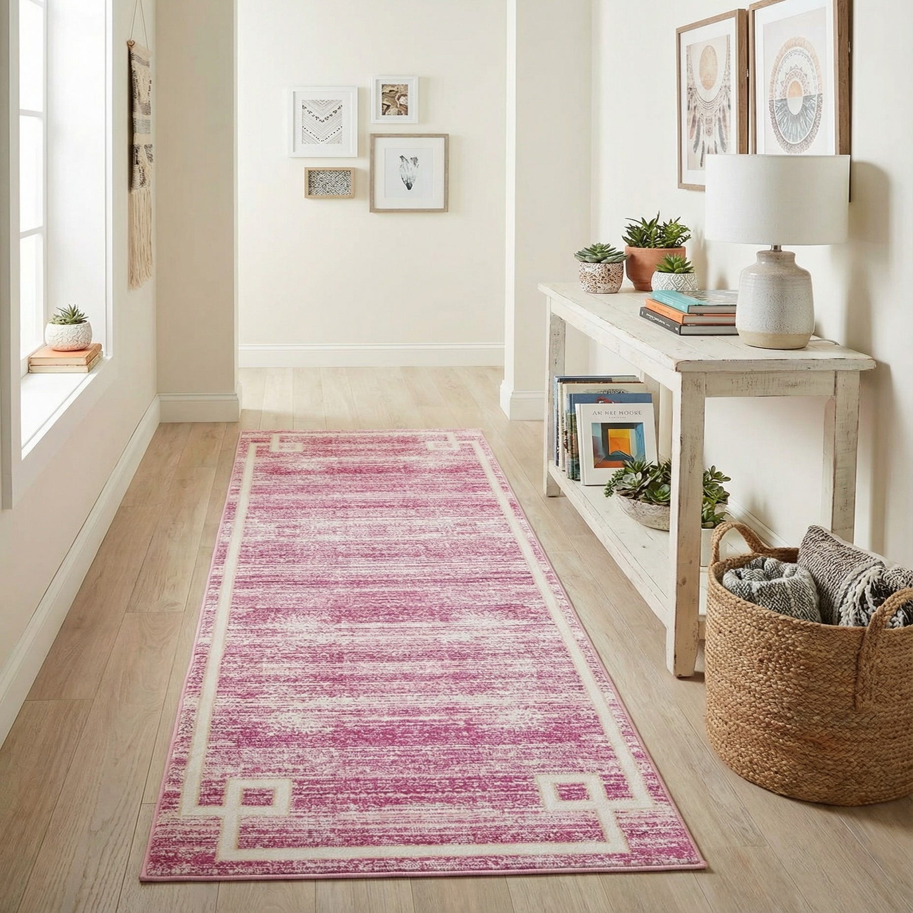 This runner is well-suited to hallways, entryways, or a narrow kitchen aisle where a pop of color helps define the path. It pairs nicely with light wood floors and white or neutral cabinetry, and complements contemporary, Scandinavian, or modern-farmhouse schemes. Use it to bring a subtle feminine touch to a bedroom or nursery, or layer it in a living space with blush tones, brass accents, and clean-lined furniture for a cohesive, modern look.