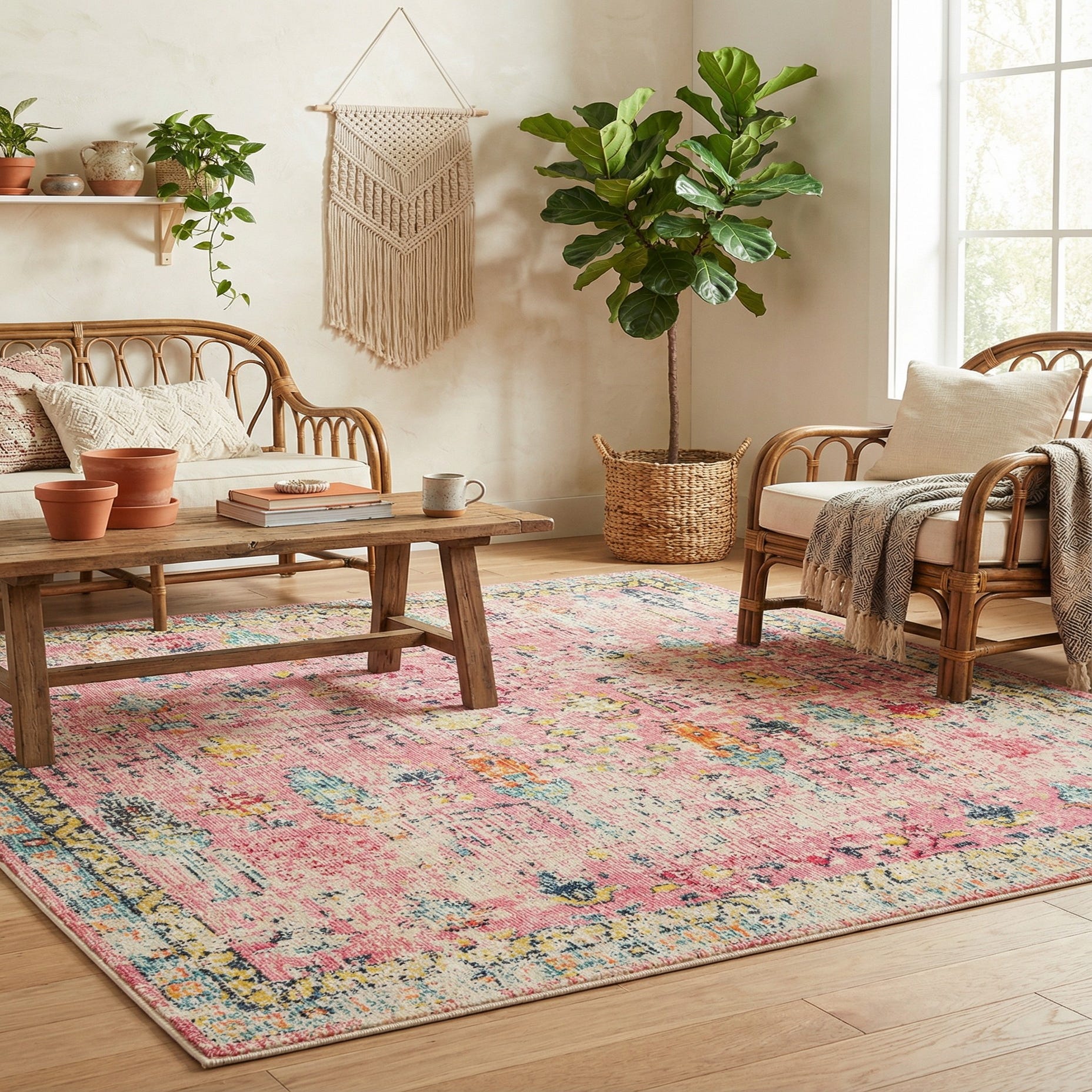 A warm pink field anchors a vintage-inspired Persian pattern where stylized florals, urn shapes and a loose medallion composition read like hand-dyed motifs across the surface. Turquoise and navy define many of the design elements while gold, olive, orange, purple and red provide lively accents that sit against the pink background. A narrow, patterned border frames the design and the overall finish has a gently distressed look that gives the rug a collected, lived-in character.