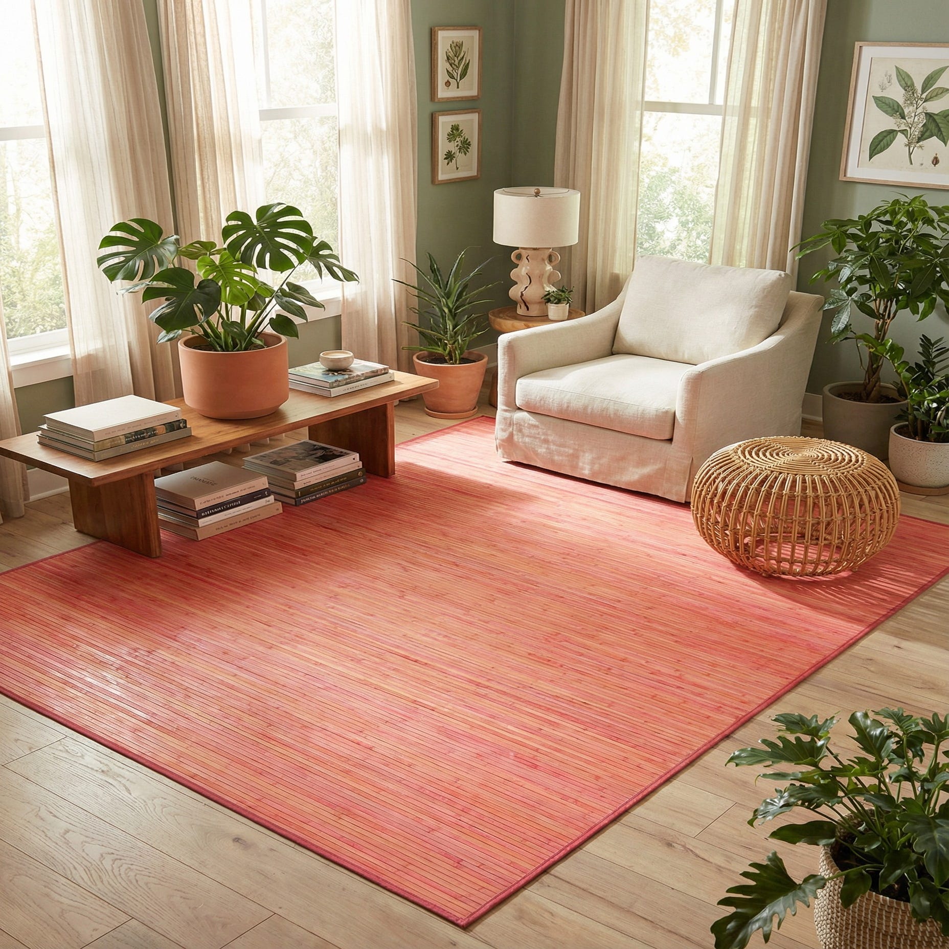 Machine-made from 100% bamboo, this rug presents a clean, horizontal slat pattern in a warm pink palette. Narrow bamboo strips run across the surface, showing subtle tonal variation and natural grain that create gentle linear movement without added ornament. A slightly deeper pink binding frames the piece, keeping the look tidy and tailored. The surface is low-profile and firm, with the natural texture of bamboo giving a subtle ribbed feel underfoot.
