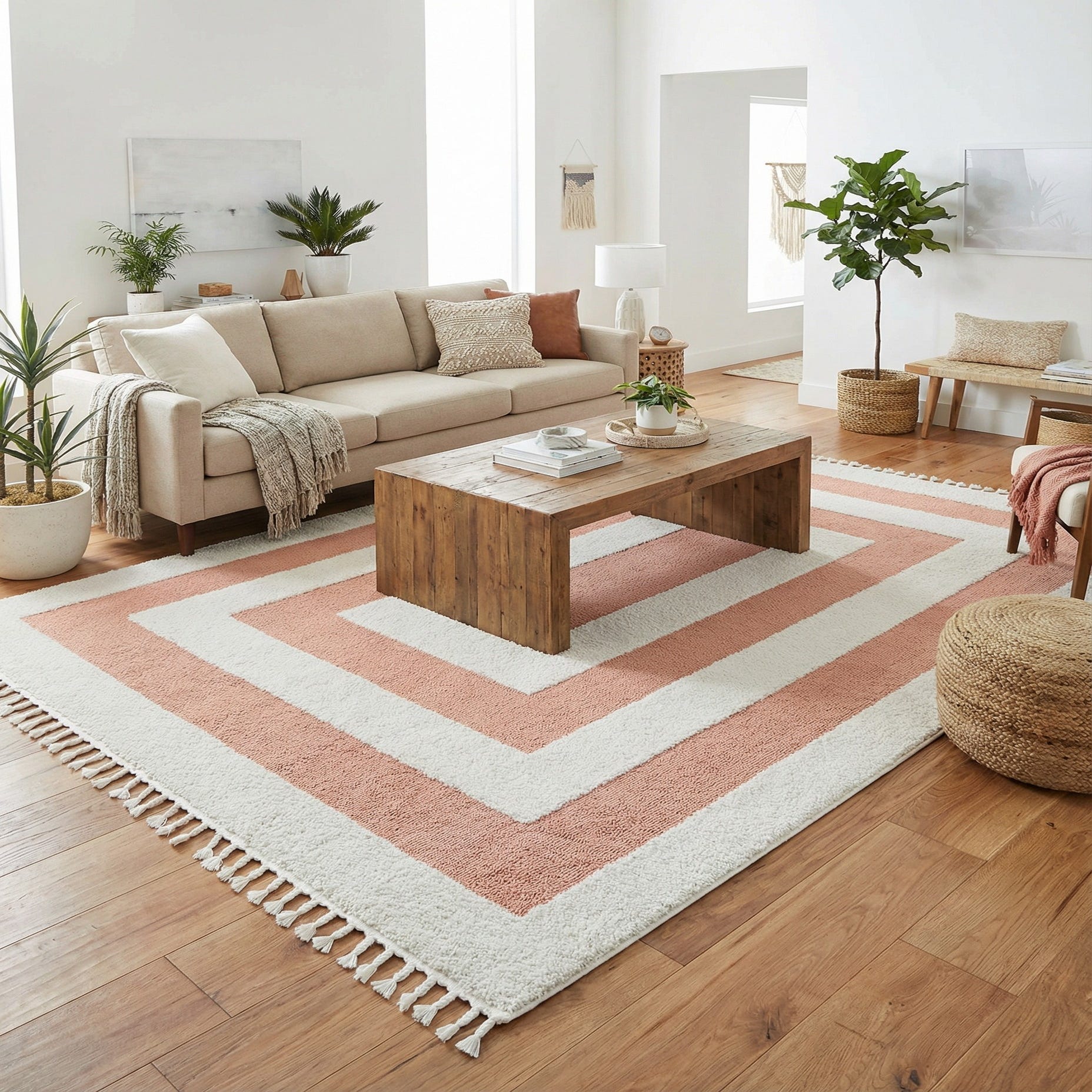 A calming interplay of pink and ivory shapes this geometric area rug, with a pink field set off by alternating ivory rectangular bands that step inward toward the center. Machine-made from 100% polyester, the surface has a low-to-medium pile that feels soft and slightly cushiony underfoot; the alternating bands read as subtly raised, adding gentle texture. Finished with short knotted fringe on the ends, the overall look balances clean lines with a relaxed, handcrafted touch.