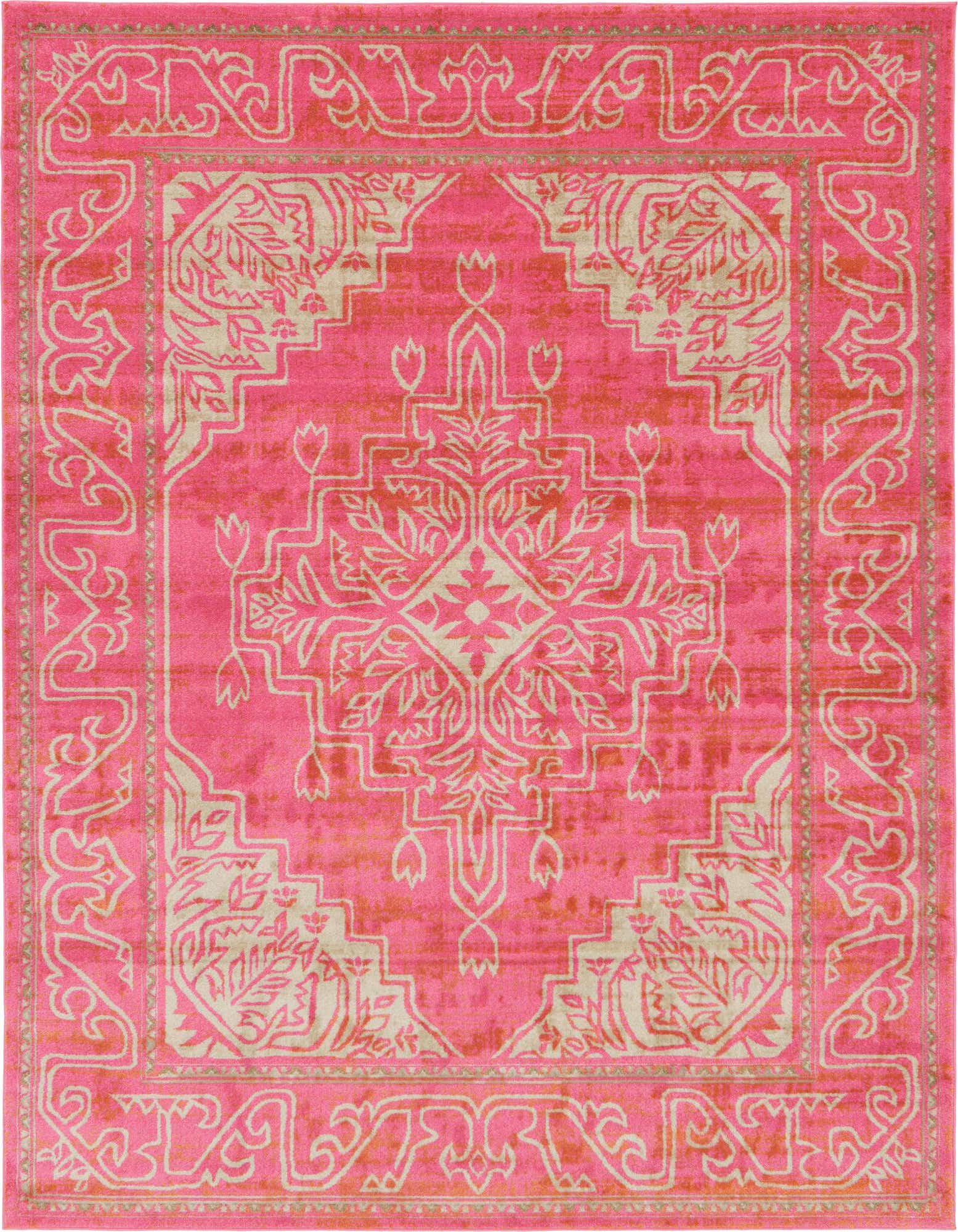 Primary color is Pink. Colors in this rug include: Pink, Orange, Ivory.