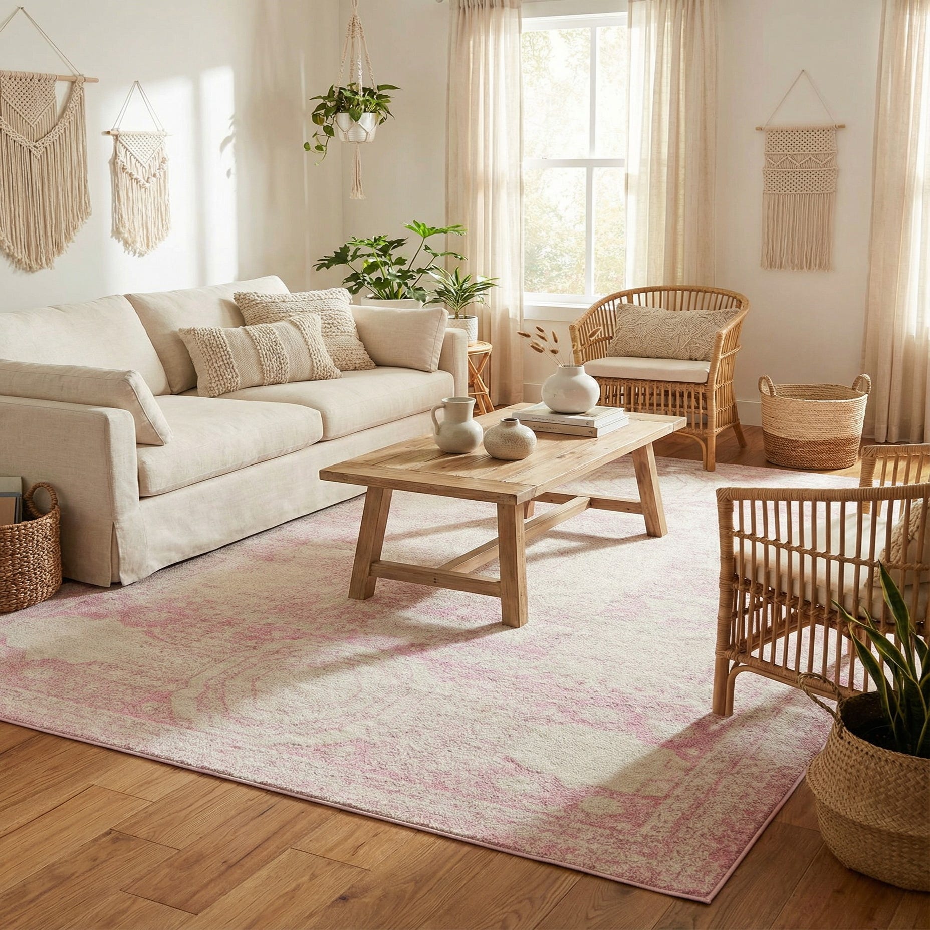 Machine-made from 100% polypropylene, the rug has a low, even pile that feels smooth underfoot while maintaining clear pattern definition across the pink and ivory tones. Ideal for a bedroom or nursery to add a warm, calming foundation; it also works well in a light-filled living room paired with neutral sofas or layered in a cozy reading nook. Combine it with natural wood furniture, cream textiles, and brass or matte-black accents for a fresh, contemporary take on traditional styling.