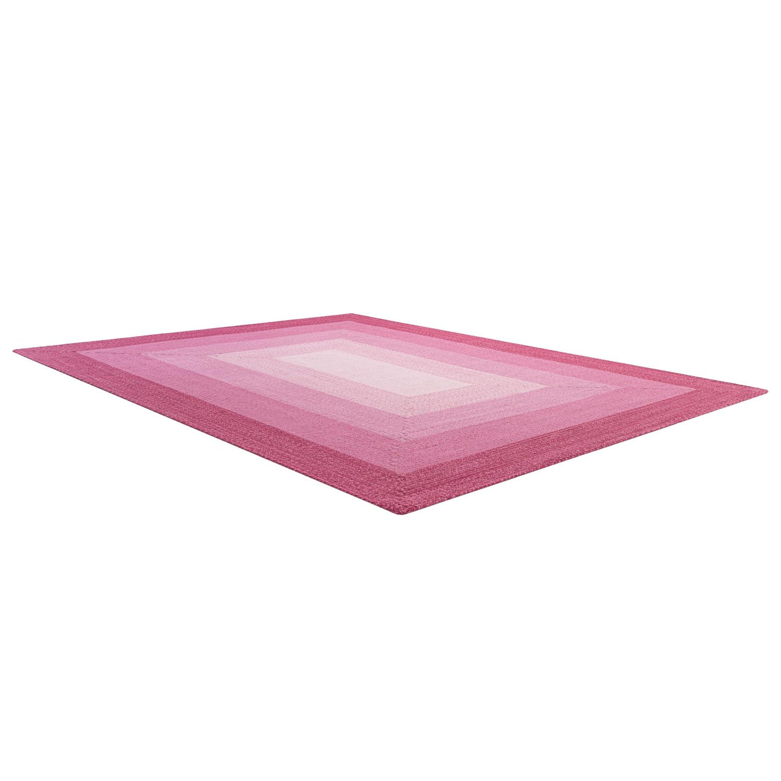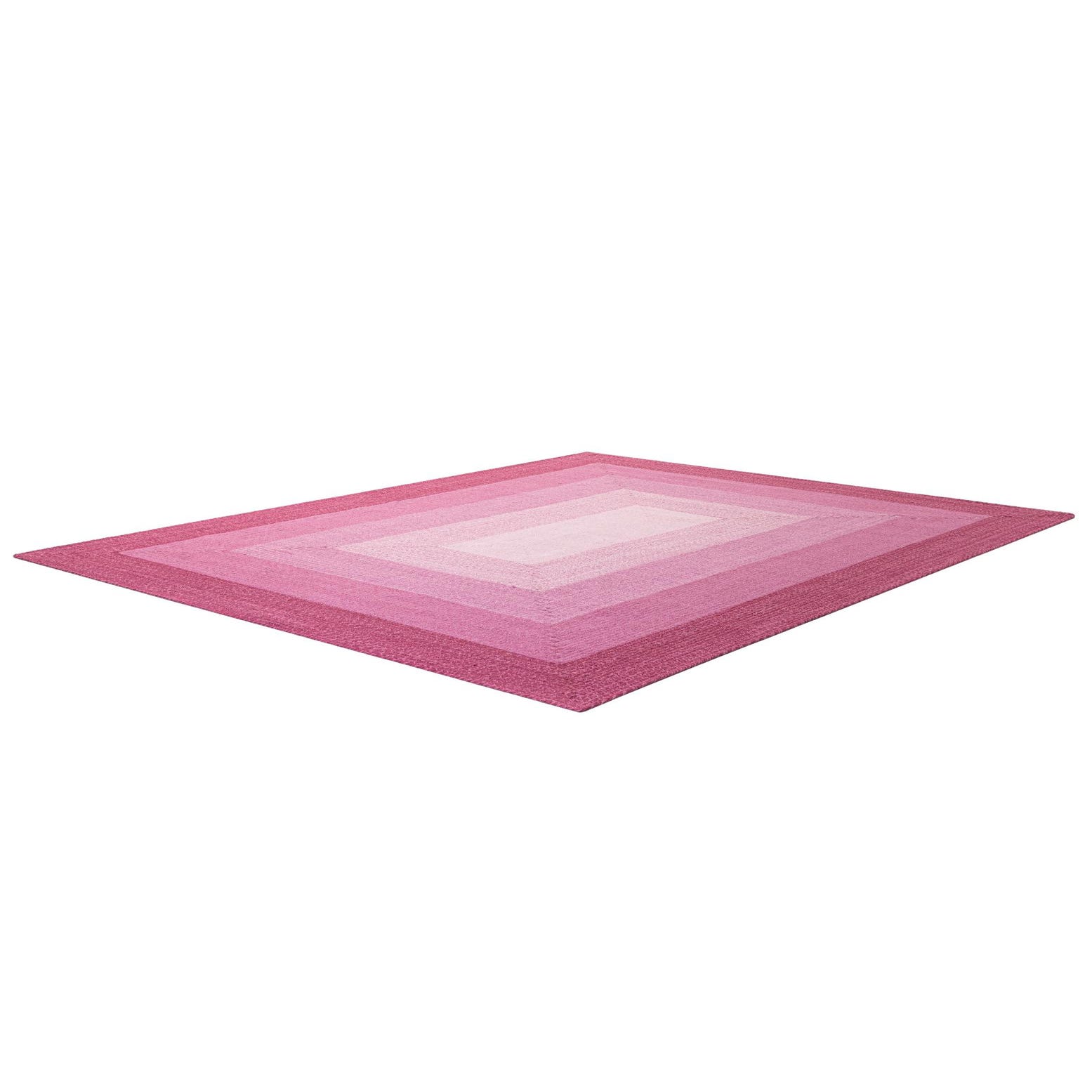 A rectangular 8x10 hand-braided wool rug featuring a modern ombre design with shades of pink, from deep fuchsia to light blush, creating a gradient effect.