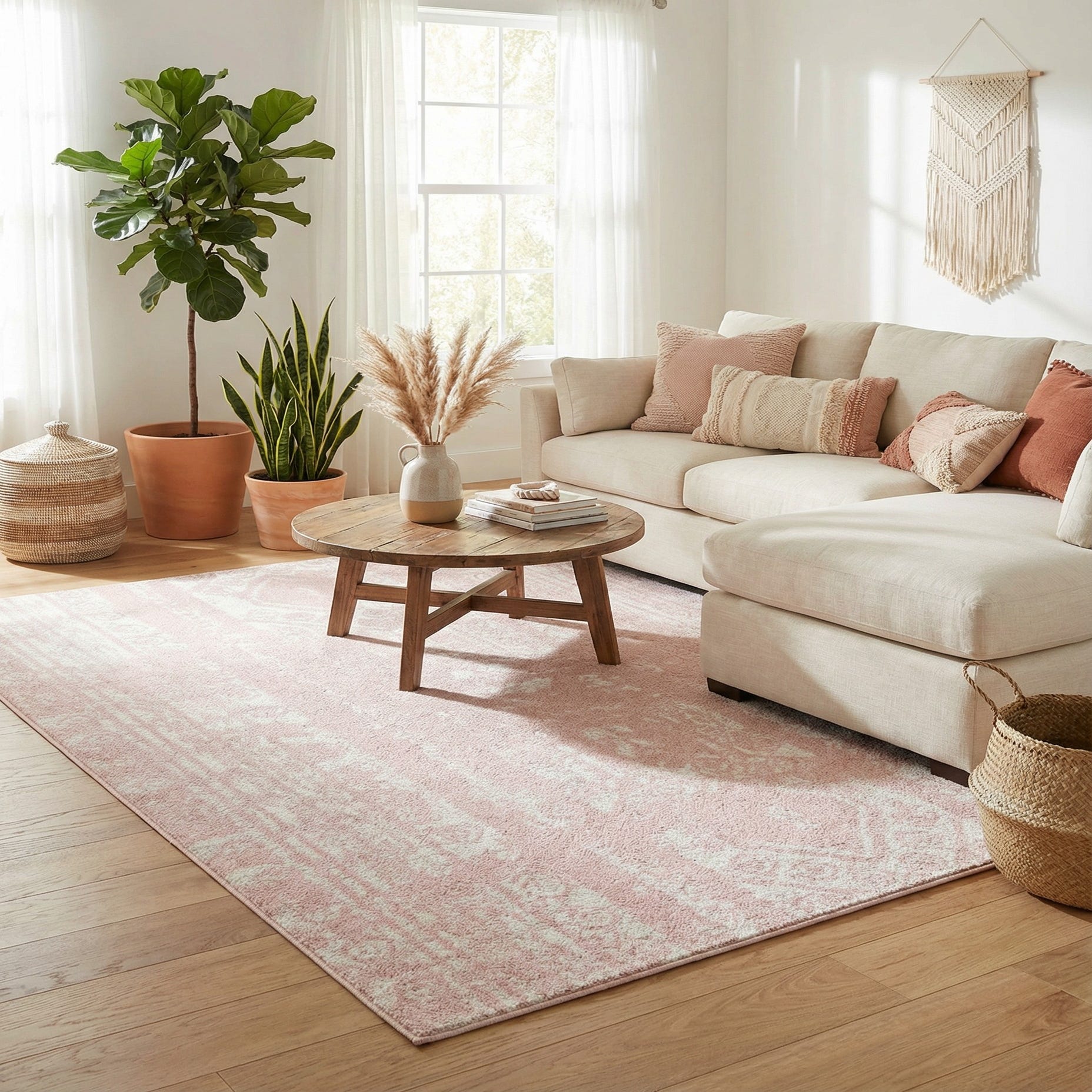 This rug works beautifully in a light, airy bedroom or nursery, where the pink and ivory palette complements white or warm wood furniture and linen textiles. It also pairs well with modern boho or shabby-chic interiors—layer it beneath a coffee table in a casual living room or place it in a seating nook to soften hardwood floors and tie together blush tones, brass accents, and neutral upholstery.