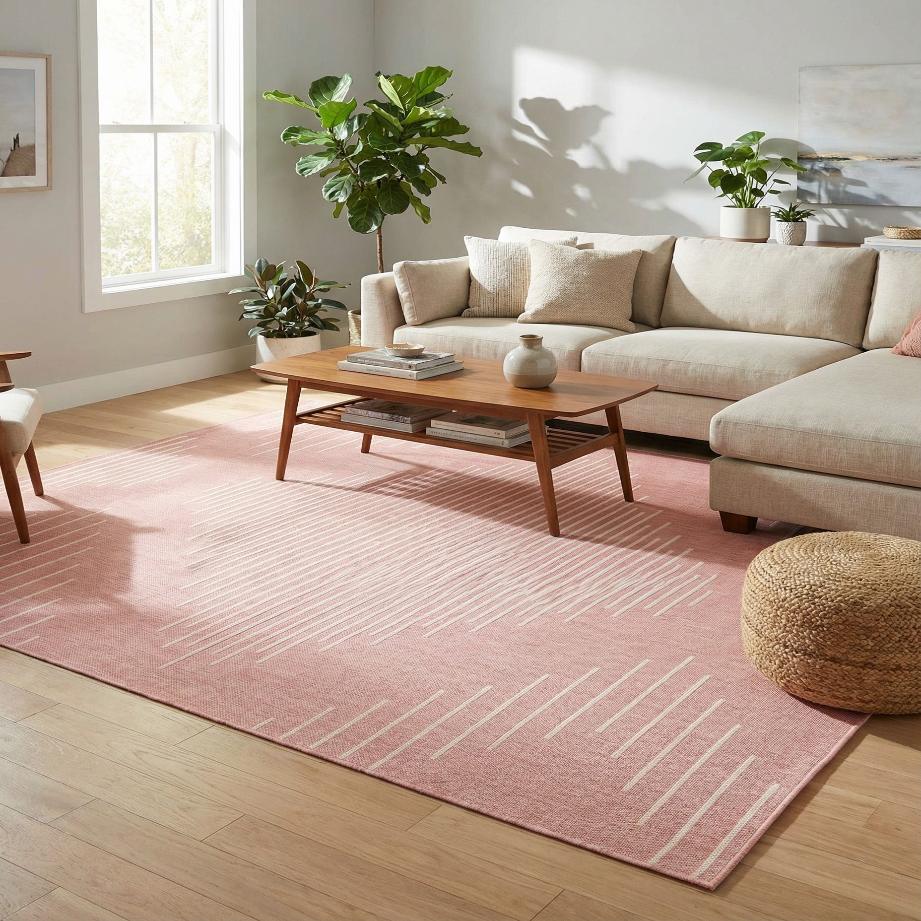 A soft pink field provides a warm, modern backdrop for a graphic arrangement of thin ivory lines that form a large central lozenge and smaller, staggered motifs toward the edges. The horizontal linear stripes give the design subtle movement and a contemporary, geometric feel without overwhelming the space. Machine-made from 100% polypropylene, the rug has a low-profile, flat weave with a smooth, slightly textured surface that feels sturdy underfoot.