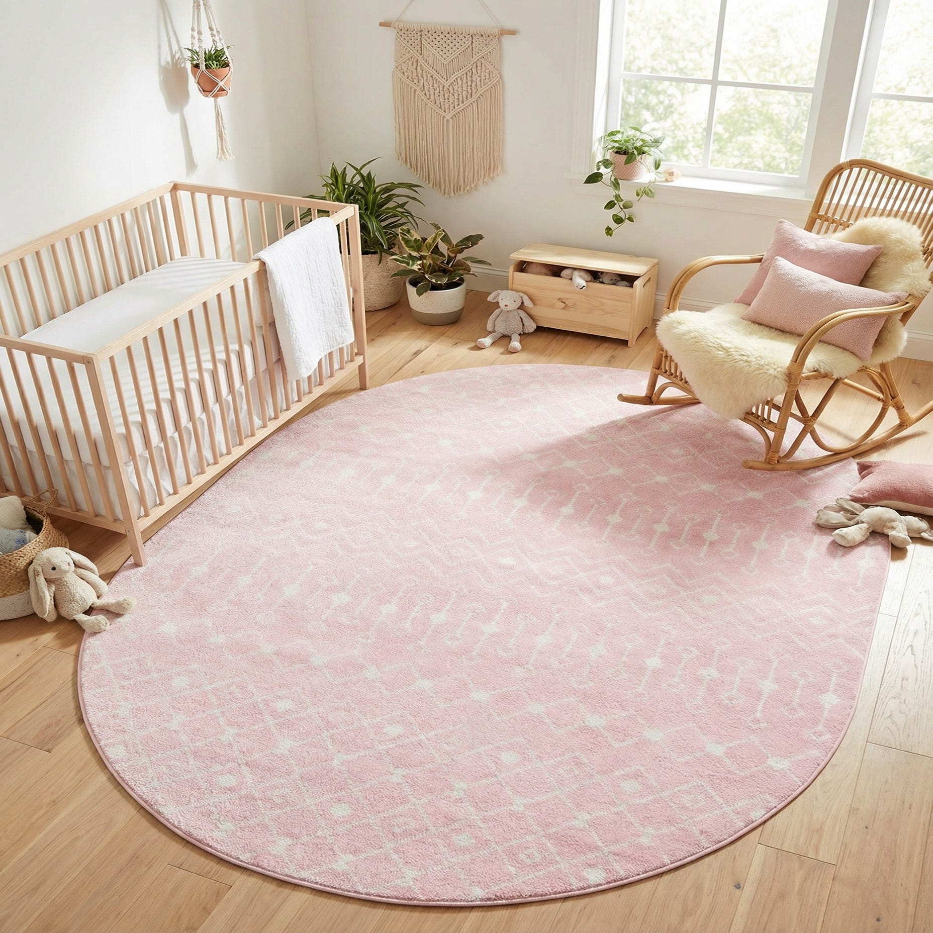 Machine-made polypropylene creates a low-profile pile that feels smooth and slightly cushioned underfoot, with a subtle, slightly heathered finish where the ivory pattern blends into the pink ground. This piece complements a nursery or child's room, a cozy reading nook, or a feminine bedroom; it also layers well with natural wood furniture, white lacquer pieces, or soft metallic accents for a modern-traditional mix.