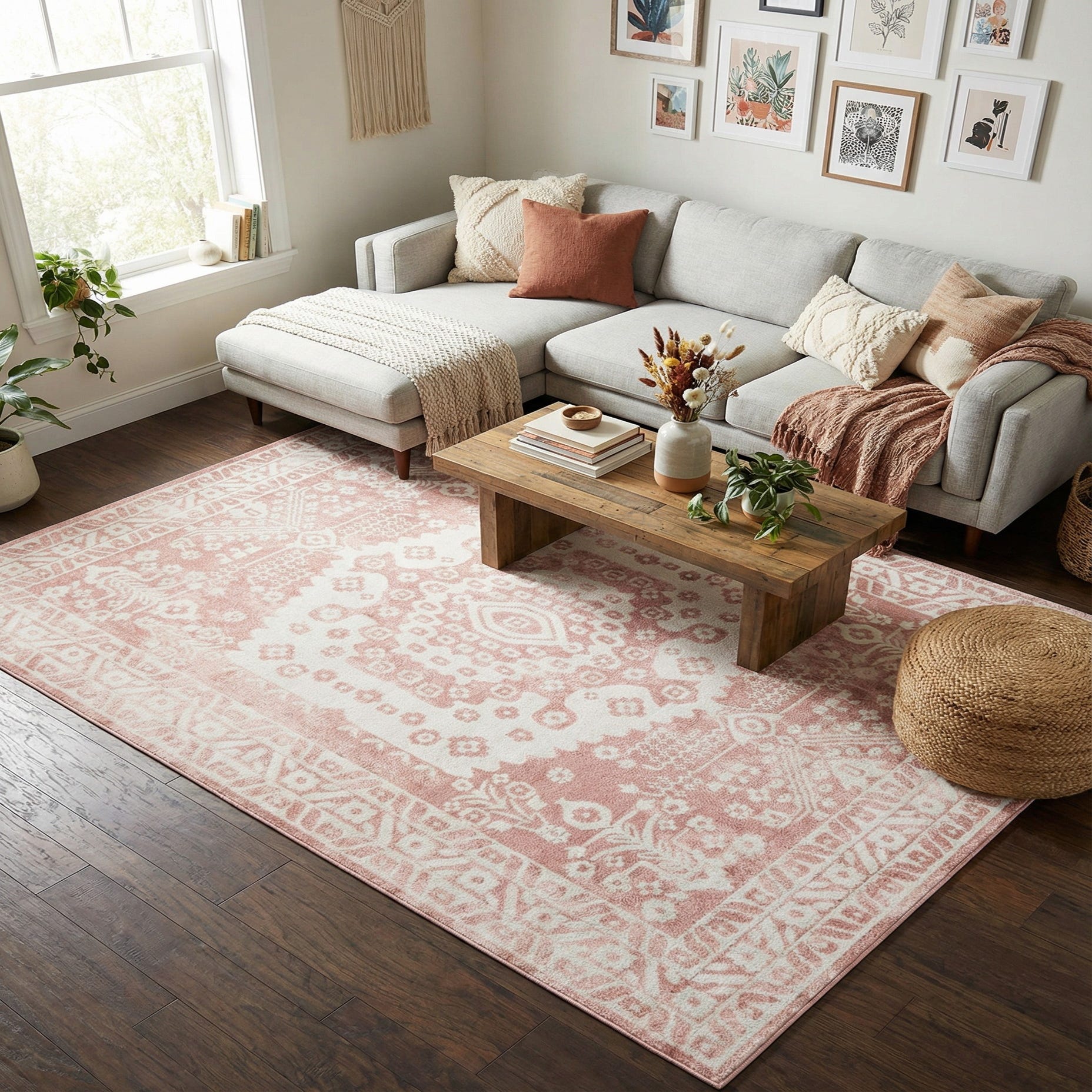 This rug would complement a range of decor scenarios. It would serve as a softening element in a minimalist space, add a touch of color in a neutral-toned room, or provide a harmonious backdrop in eclectic or bohemian-inspired settings. Additionally, its stain-resistant qualities make it a functional choice for dining areas or living rooms where spills are a concern.
