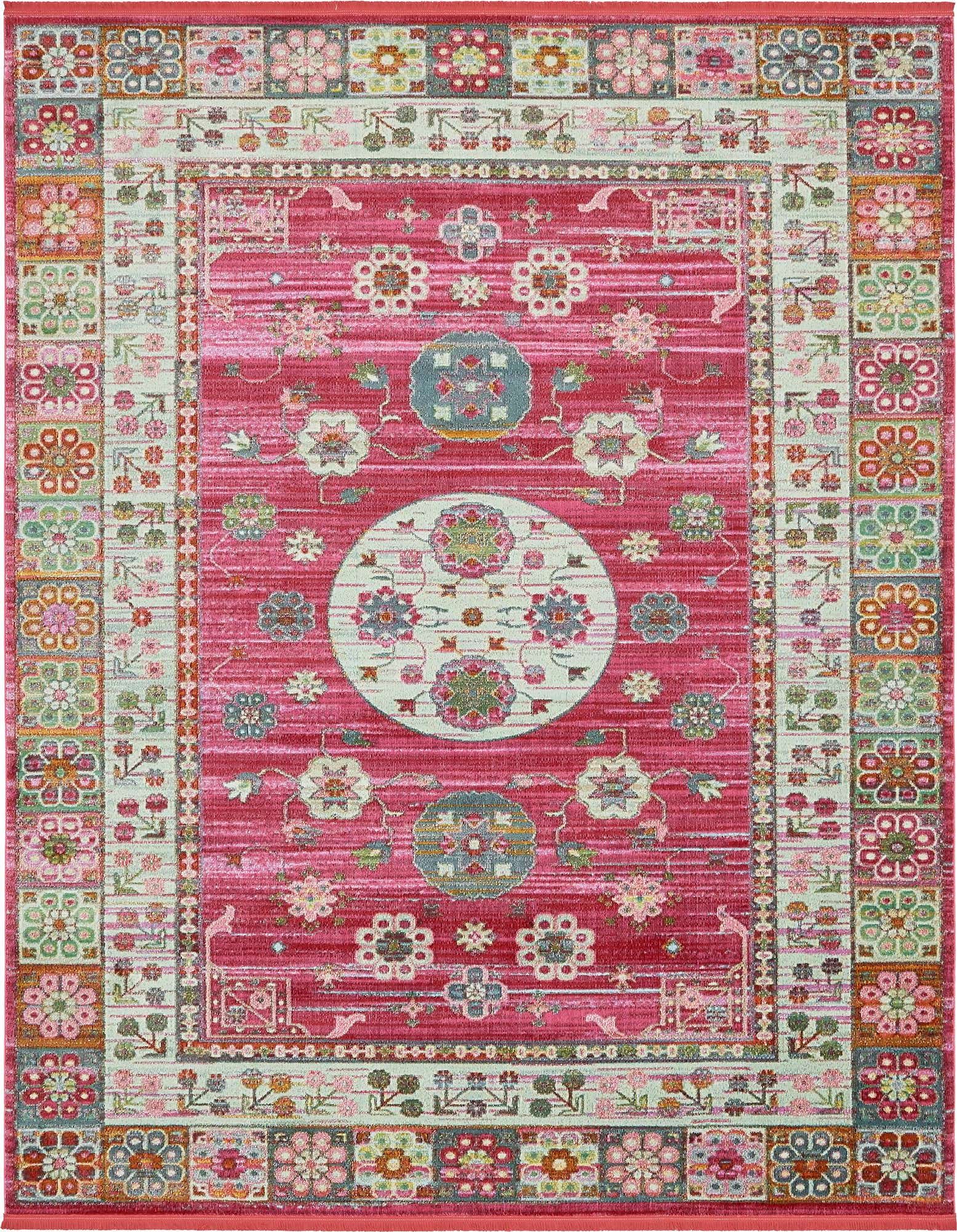 Primary color is Pink. Colors in this rug include: Pink, Blue, Green, Ivory, Orange, Purple.