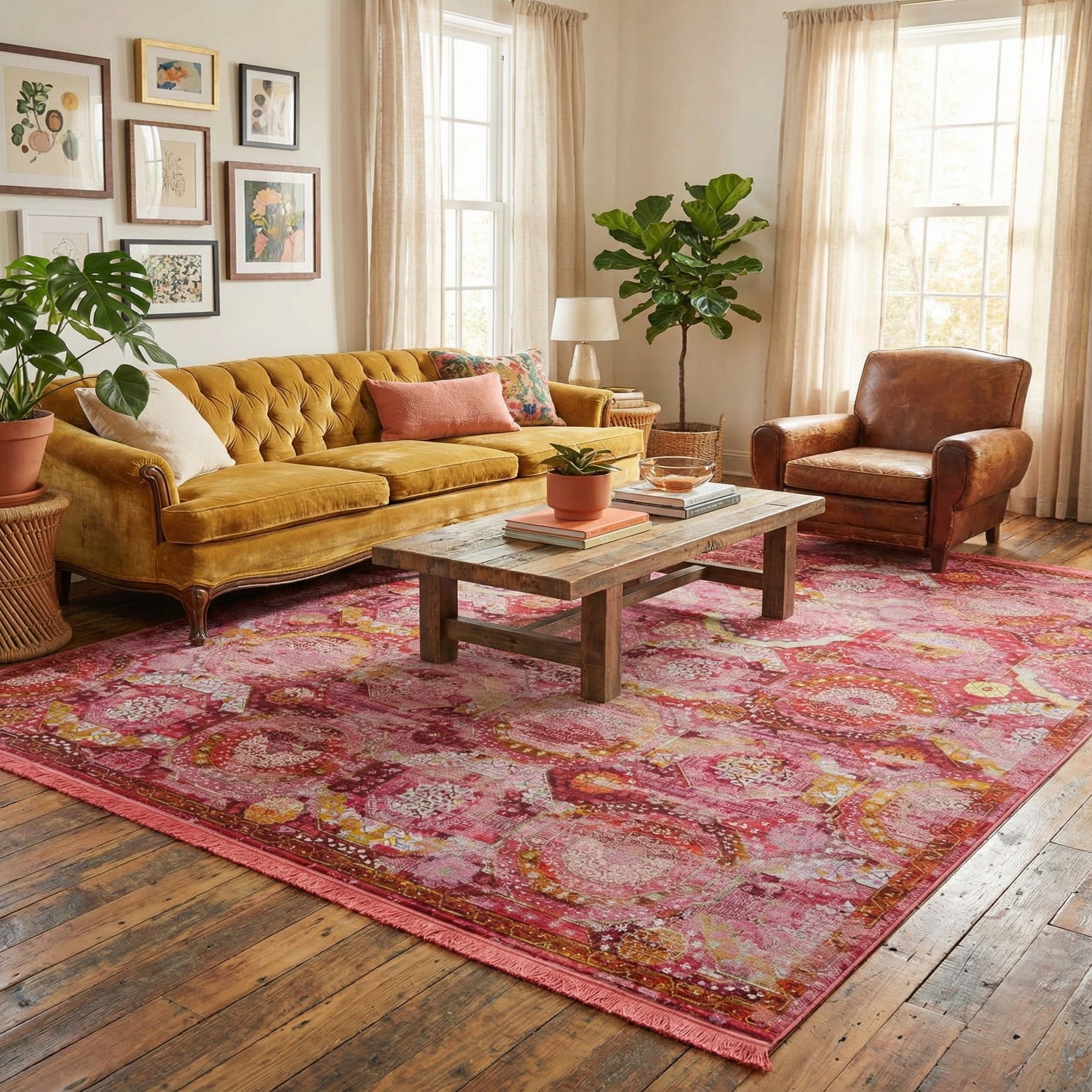 Primary color is Pink. Colors in this rug include: Pink, Burgundy, Ivory, Olive, Orange, Purple, Red.