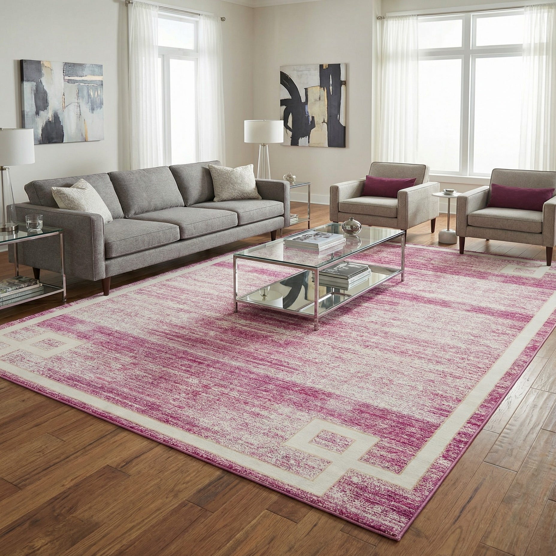A soft pink field is woven with a worn, striated texture that reads like a faded, horizontal wash of color. Ivory and beige highlights peek through the surface, creating a subtle contrast and a clean border defined by simplified Greek-key corner blocks. The low-pile construction has a smooth, slightly velvety hand and a gentle sheen from the polyester fibers; machine made from 70% polypropylene and 30% polyester for consistent color and finish.