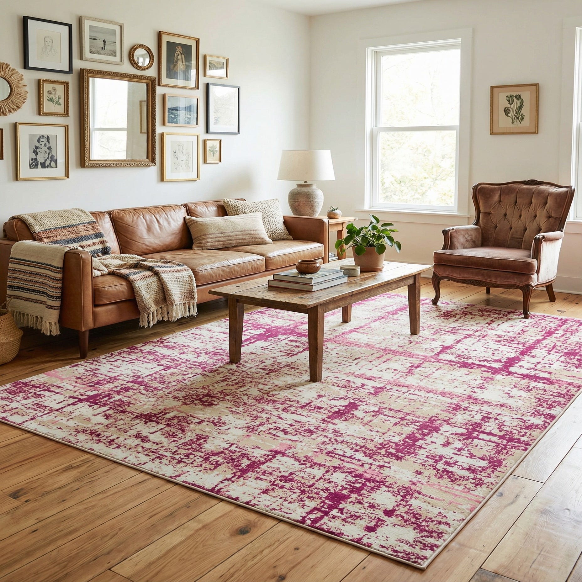 Primary color is Pink. Colors in this rug include: Pink, Ivory.