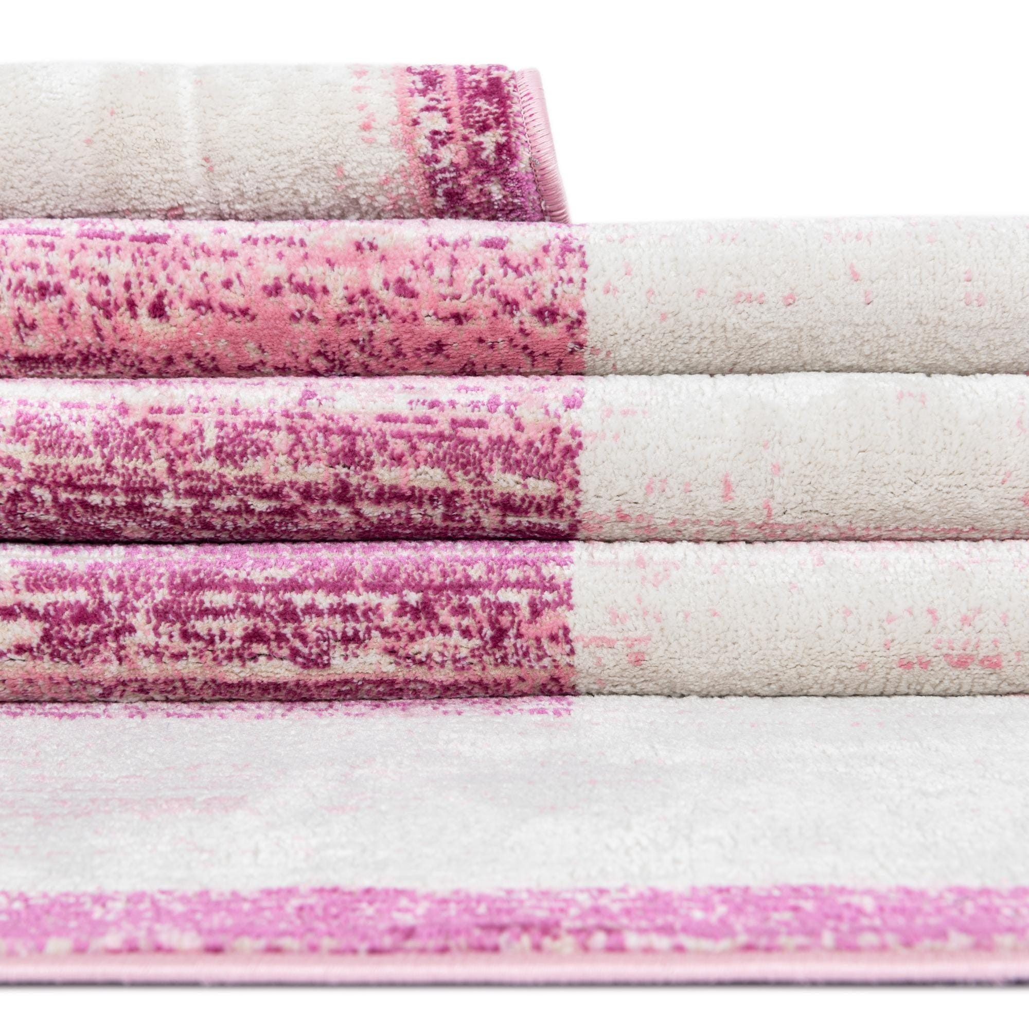 A soft pink ground forms the foundation of this rug, woven with variegated pink tones and subtle ivory highlights that create a horizontal, striated field. A wide ivory border frames the center, with a narrow pink edge that brings the whole palette together. Machine made of 70% polypropylene and 30% polyester, the surface has a low, slightly plush pile with a smooth hand and a gentle, lustrous finish from the polyester fibers. The finish feels soft underfoot while the polypropylene lends structure, giving the rug a refined, modern look without heavy texture.