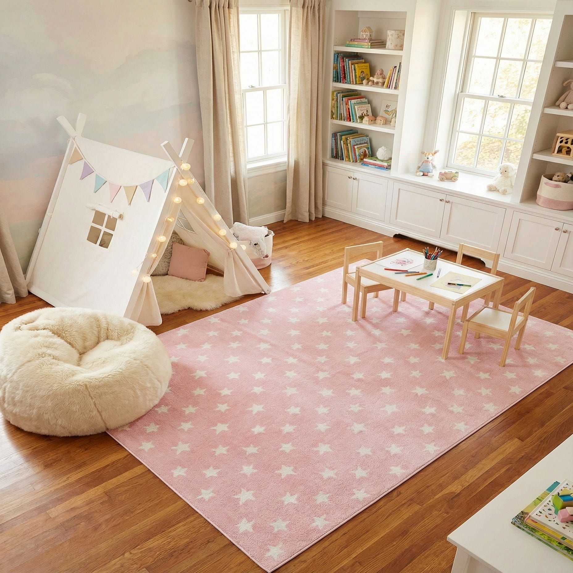 This piece works well in a nursery, children's bedroom, or playroom where a gentle pop of color and pattern is welcome. It layers nicely over hardwood or pale carpet and pairs with white furniture, natural wood tones, blush bedding, and soft gray accents for a cohesive, inviting scheme. Its practical construction makes it appropriate for casual family spaces and contemporary, Scandinavian, or cottage-inspired interiors.