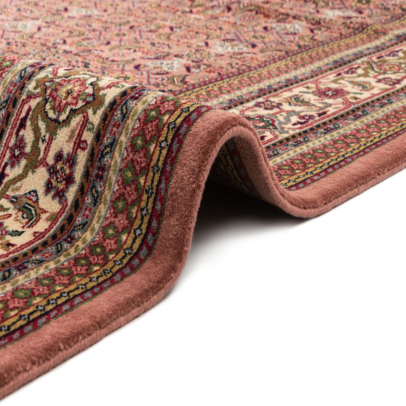 A rectangular 8x11 pink traditional Farahan rug with intricate floral patterns and a detailed border.