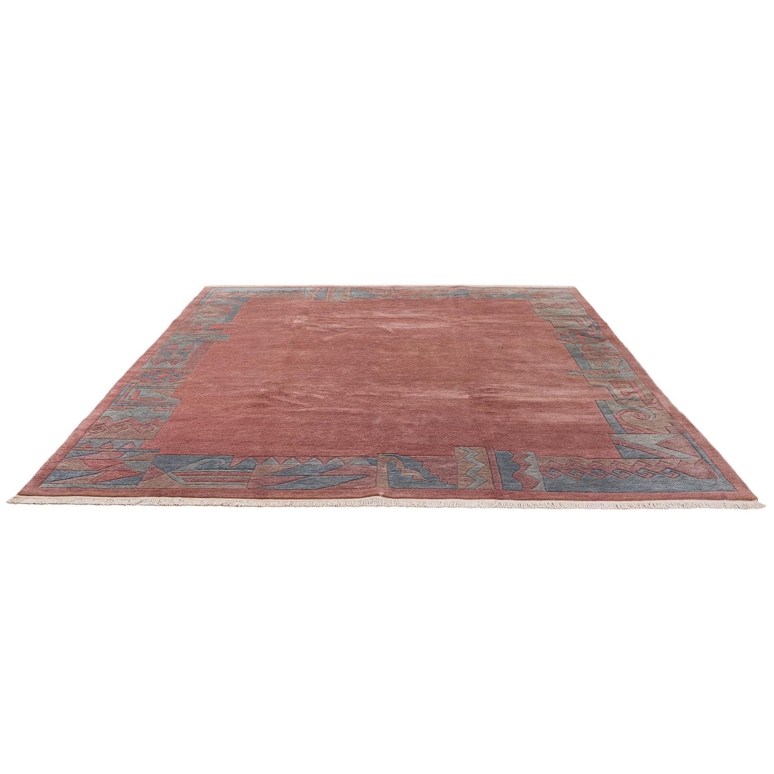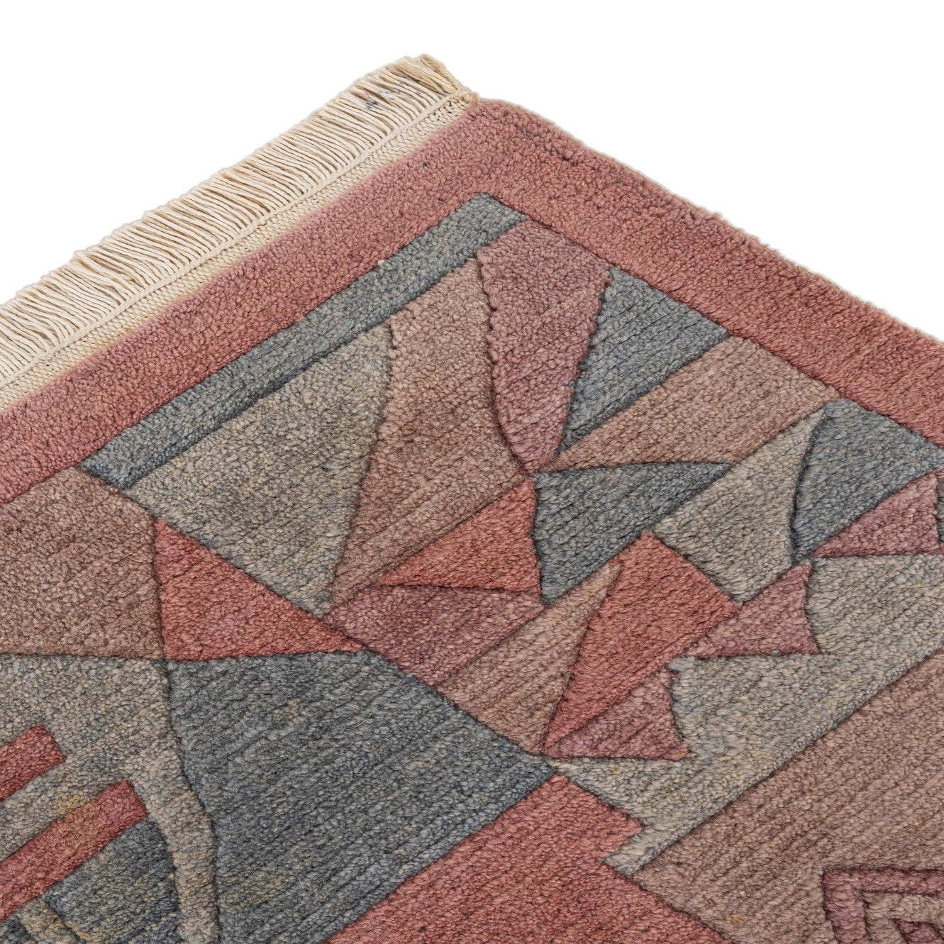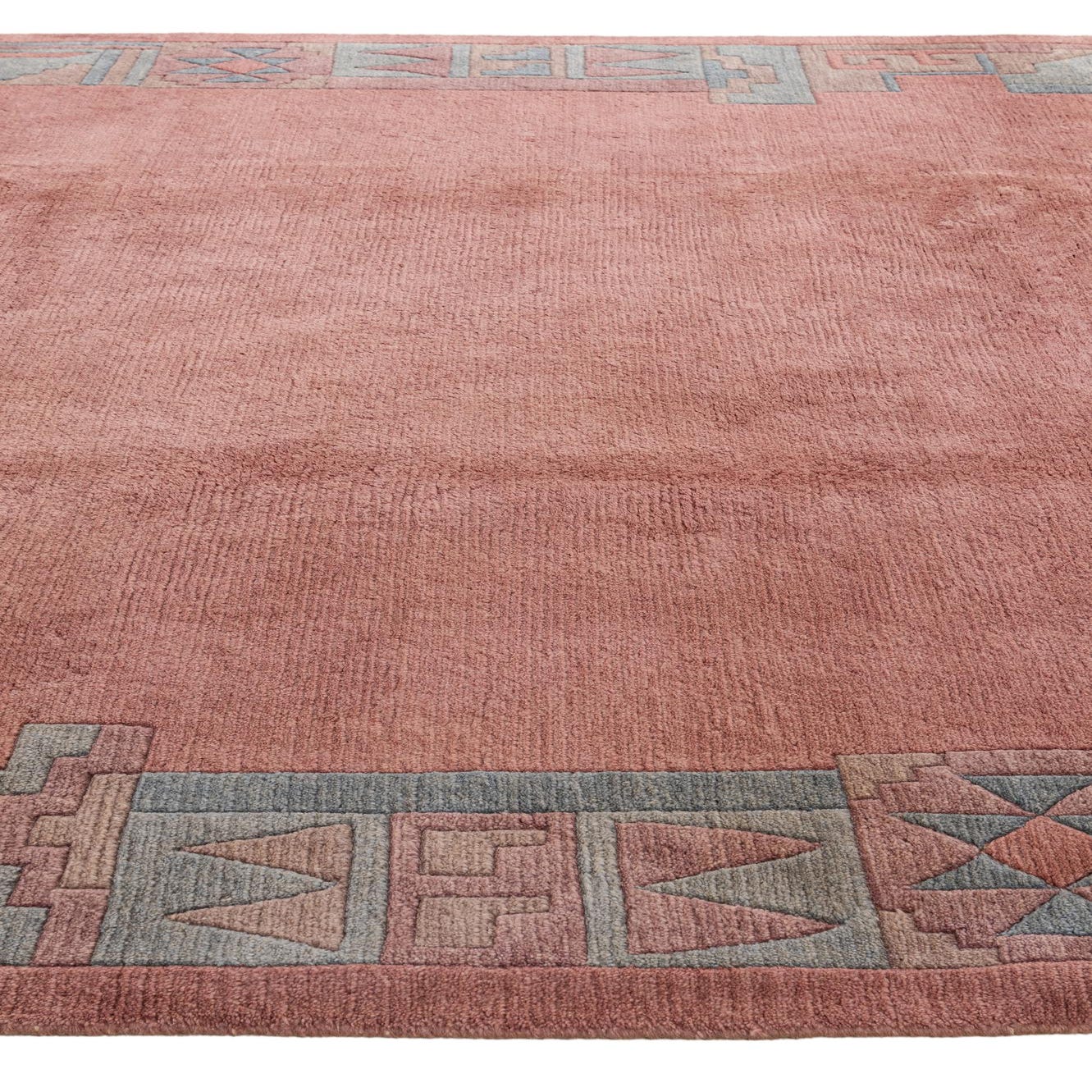 A rectangular 8x11 pink wool area rug with a modern abstract border in shades of blue and muted pink.