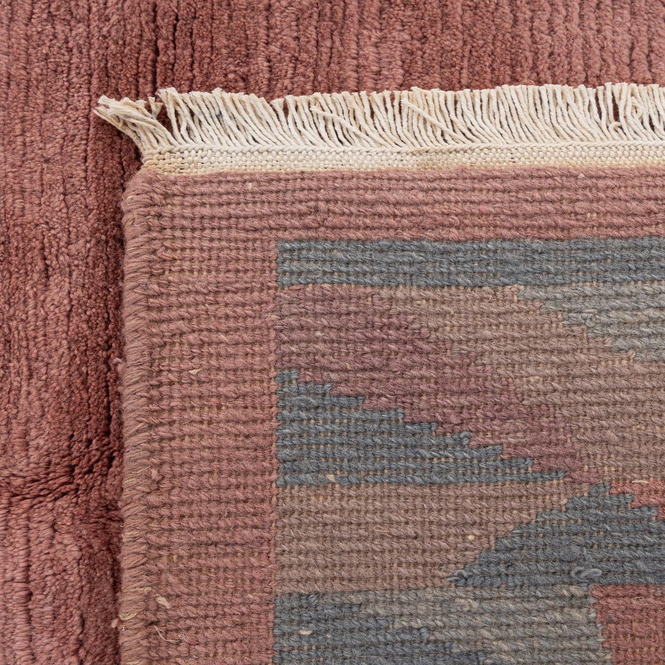 Primary color is Pink. Colors in this rug include: Pink, Light Blue, Light Brown.