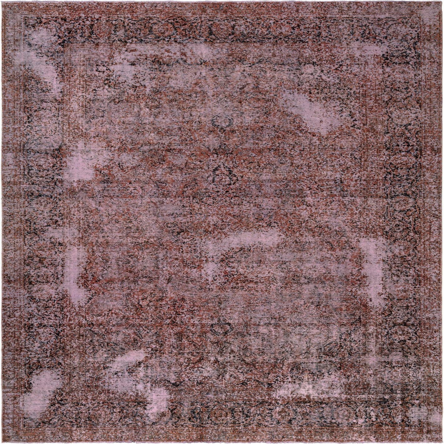 The background hue of this rug is a muted pink, providing a contemporary twist to the traditional design elements. Besides pink, this piece incorporates a diverse color palette, including shades of gray, taupe, and deeper accents that elegantly frame the central patterns and border.