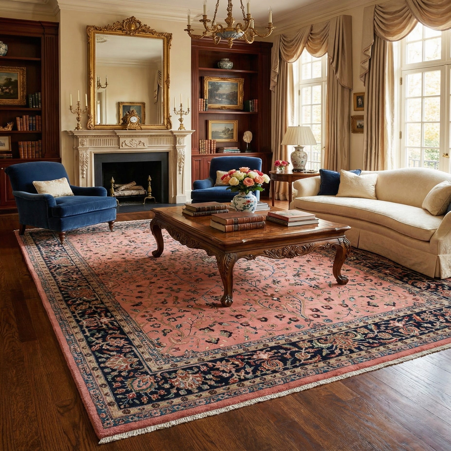 Primary color is Pink. Colors in this rug include: Pink, Brown, Beige, Navy Blue, Burgundy, Blue, Red.