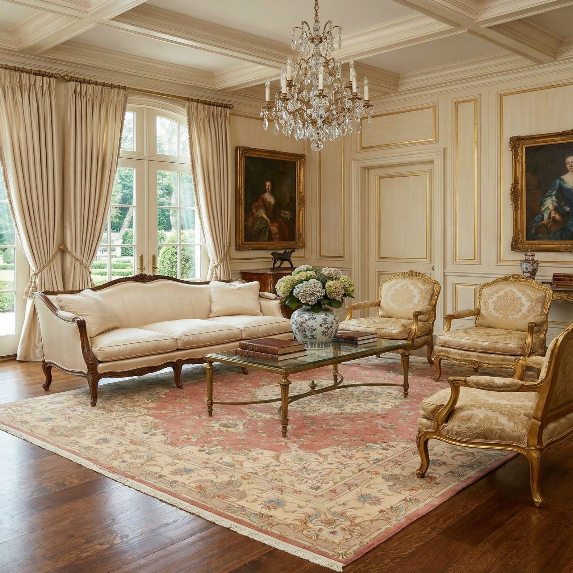 The color palette of the rug includes subtle shades of pink, beige, blue, cream, gray, green, ivory, and natural, with a pink background that offers a soft and warm ambiance. The inclusion of fringe adds to the classic aesthetic of the piece, providing an additional decorative element to its already impressive design.
