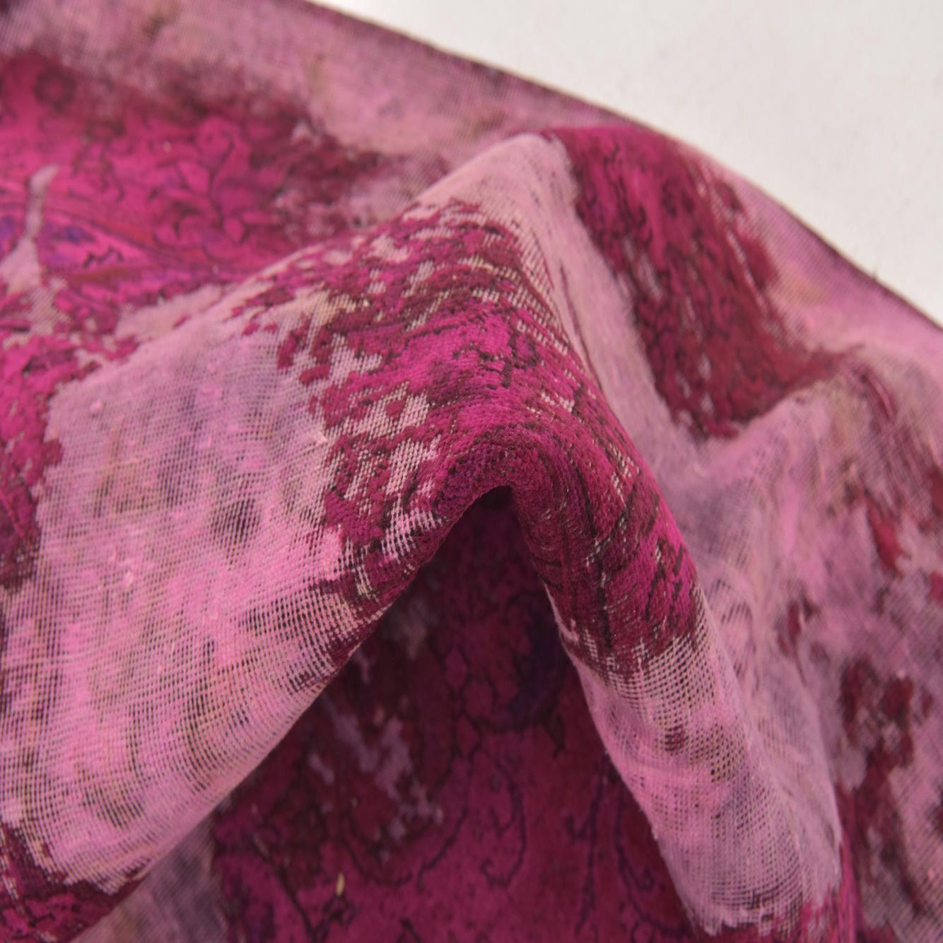 The Ultra Vintage collection presents a hand-knotted area rug measuring 8x12 feet, crafted from 100% wool for lasting quality and comfort underfoot. This rug's visual charm lies in its pattern, which offers a modern interpretation of classic motifs, elegantly displayed in an array of pink, violet, and purple shades on a pink background. Its distinctive pattern features deconstructed floral and damask elements, creating a compelling juxtaposition between traditional design and contemporary style.