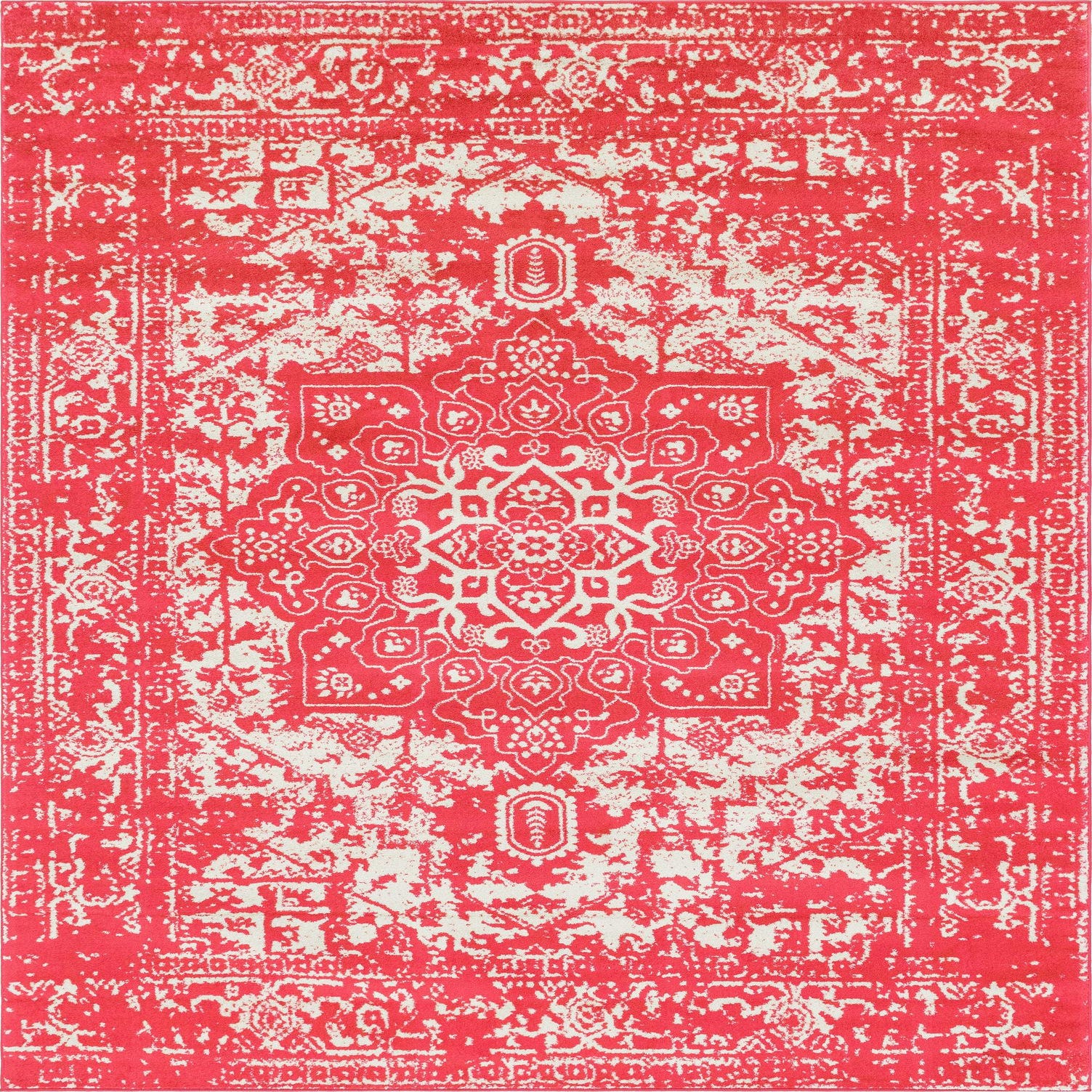 A 9x12 rectangular area rug featuring a distressed traditional medallion pattern in vibrant pink and off-white.