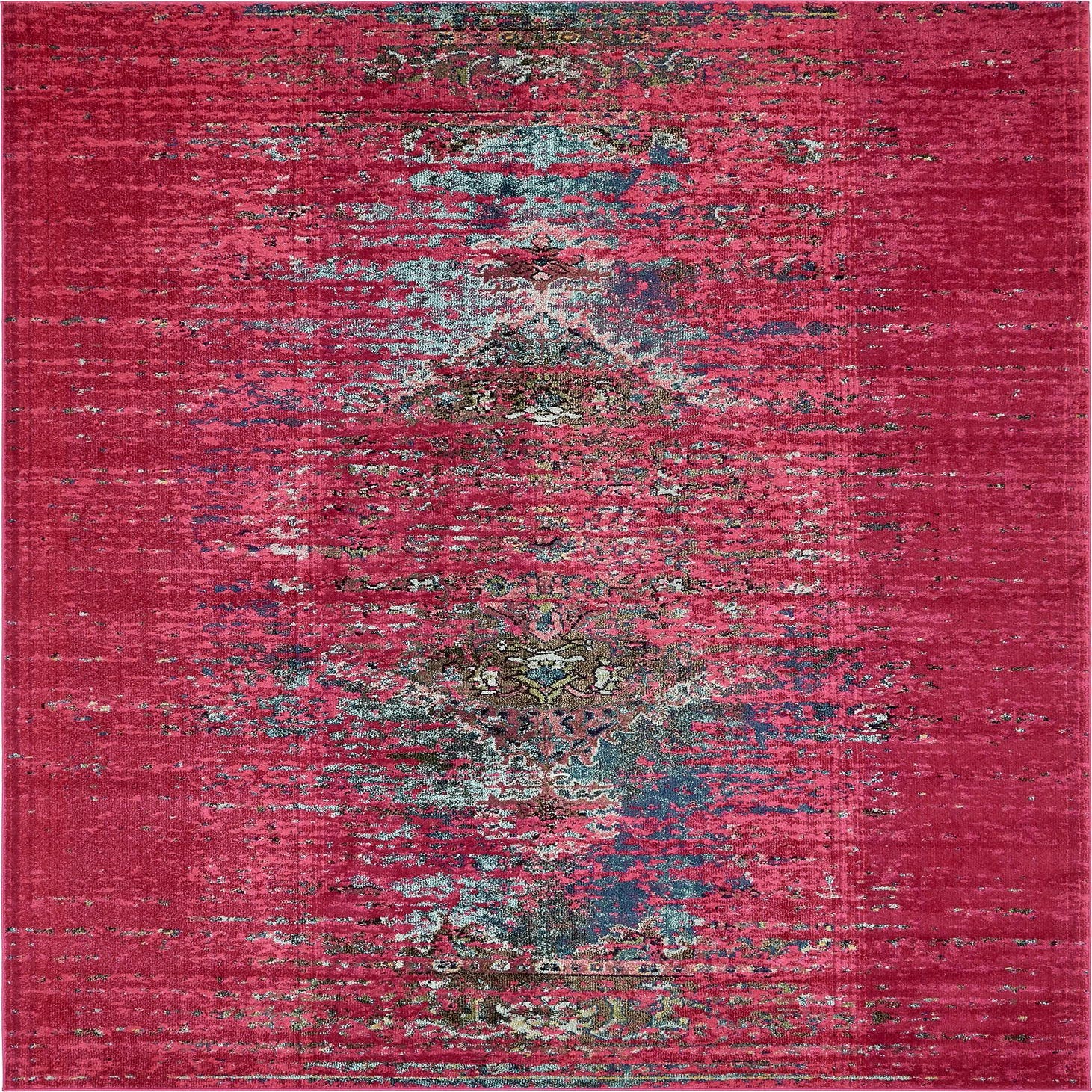 Primary color is Pink. Colors in this rug include: Pink, Blue, Brown, Navy Blue, Puce.