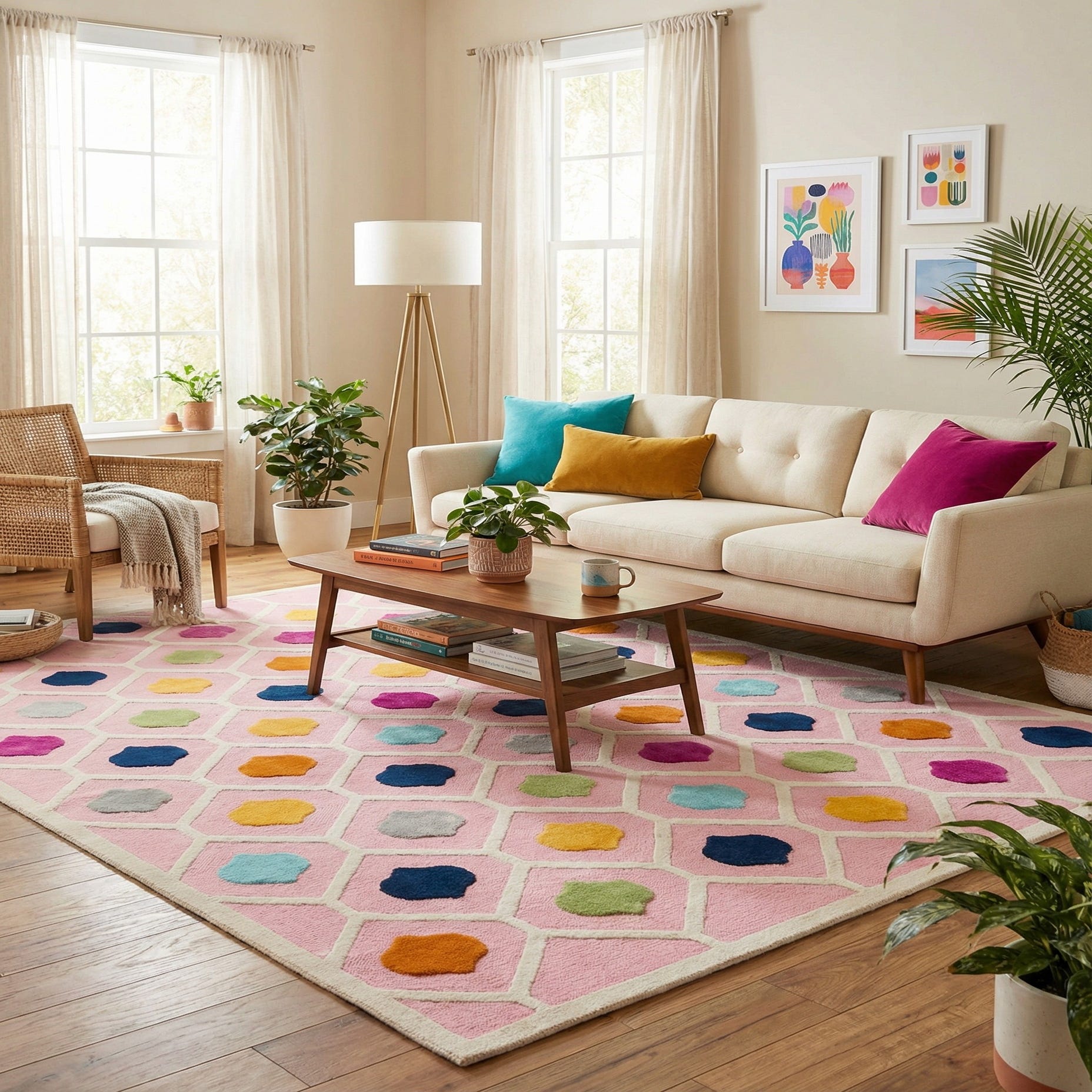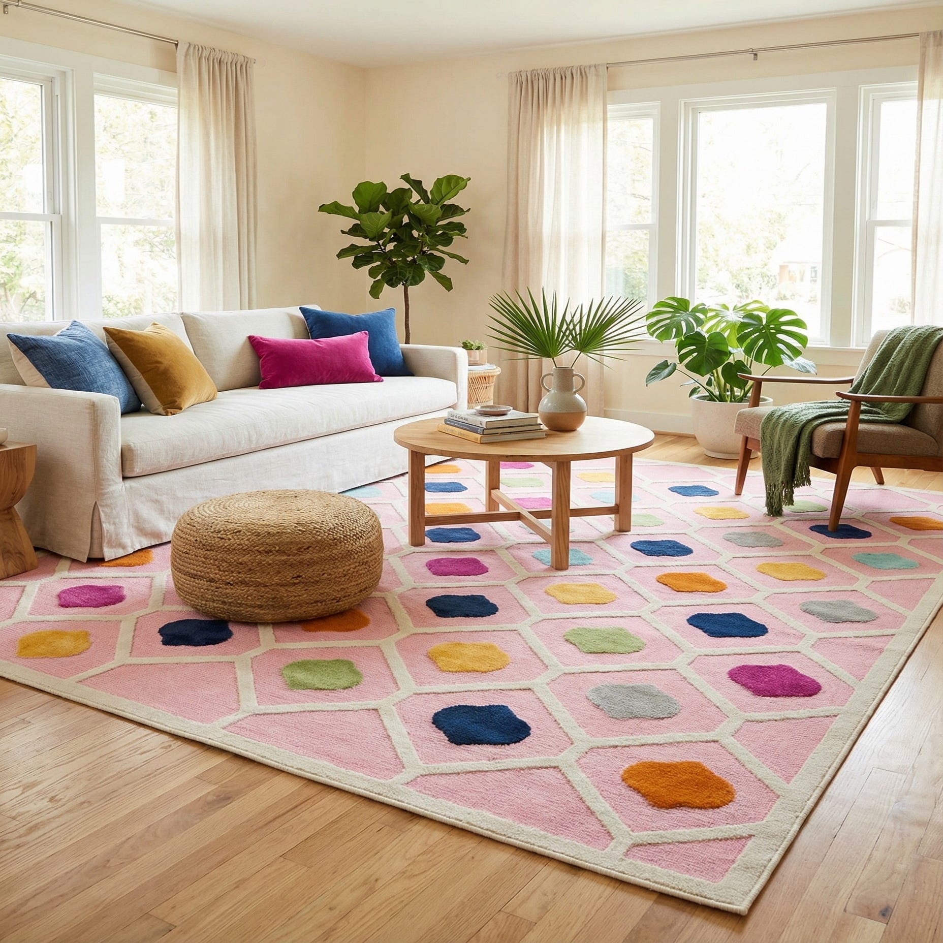 A playful geometric trellis stretches across a pink ground, with each ivory lattice cell framing a jewel-like medallion in navy, light blue, gold, orange, green and gray. The repeating quatrefoil-inspired motifs create a lively, rhythmic pattern that reads modern and approachable. Running your hand across the surface you’ll notice a consistent, low-pile feel with a slight sheen from the space-dyed polyester; the colored medallions have a subtly soft, cut-pile touch that contrasts gently with the smooth lattice lines.