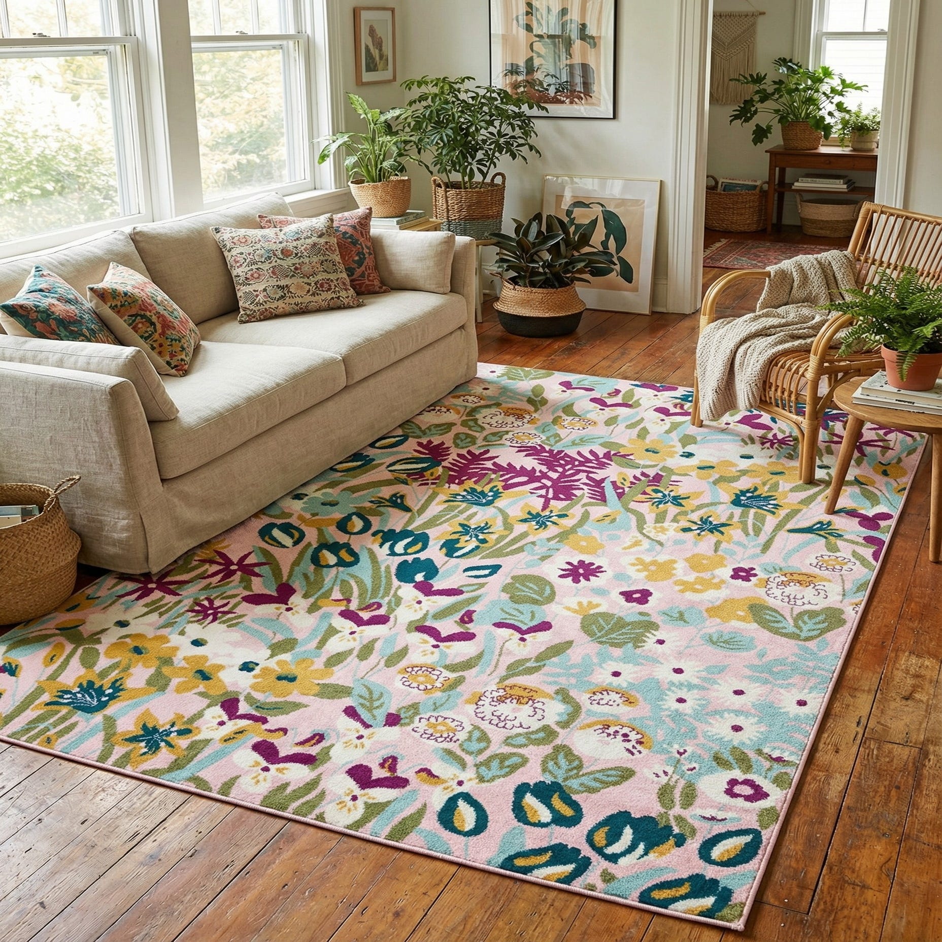 The Bloom Collection 9x12 rug presents a vibrant floral pattern that brings the essence of a springtime garden into any space. The design showcases a lively array of botanical motifs in an assortment of colors including pink, green, ivory, light blue, purple, yellow, and teal, set against a delightful pink background. This colorful palette lends itself to a variety of interior styles, making the rug a versatile choice for any room.